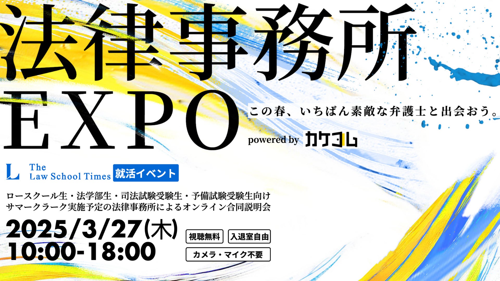 株式会社カケコム(所在地:東京都品川区、代表取締役CEO:森川照太)は、業界大手メディアであるロースクールタイムズ(運営:株式会社Legal Times、所在地:東京都港区、代表取締役CEO:晋川陸弥)主催のもと、ロースクール生・法学部生・司法試験受験生・予備試験受験生を対象とした法律事務所EXPO powered by カケコムを開催いたします。本イベントは、38の法律事務所(現状予定)の説明を1日で視聴できるオンライン合同説明会として、忙しい学生の皆様が効率よく情報収集できる貴重な機会を提供します。