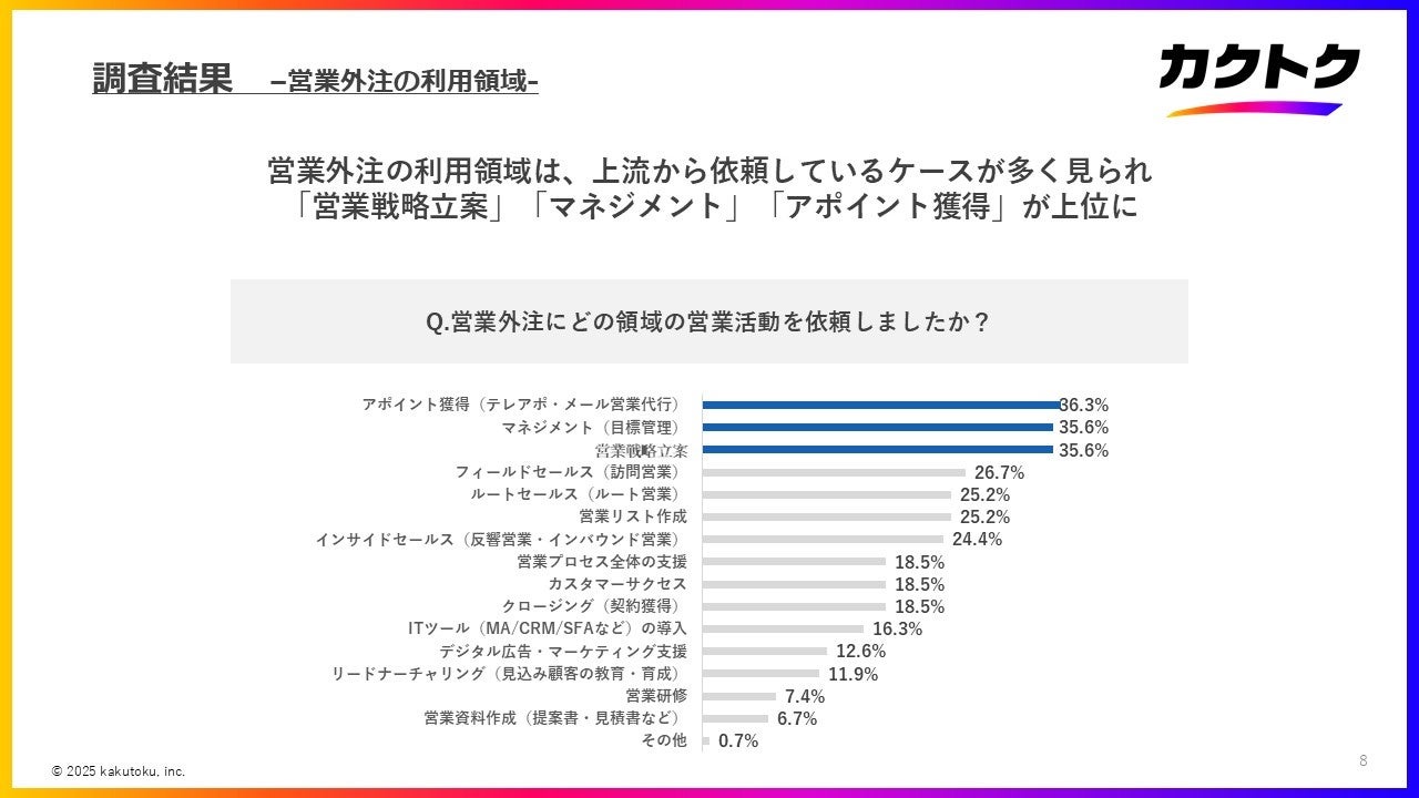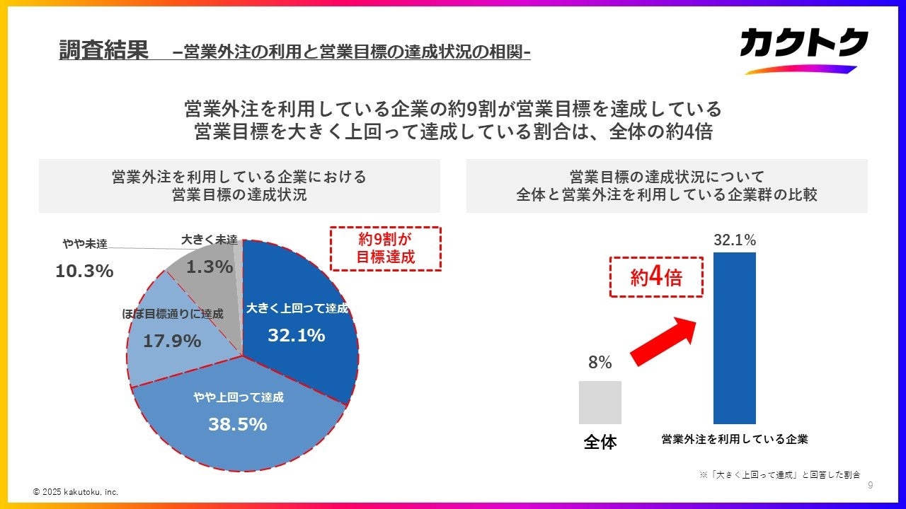 日本最大級の営業マッチングプラットフォーム「カクトク」を運営するカクトク株式会社(本社:大分県別府市、代表取締役:満田 聖也、以下「カクトク」)は、営業に関わる経営者・会社員500名を対象に「営業外注に関する調査」を実施しました。