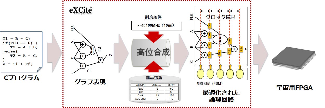 ソリトンは、このローバシステムに搭載する画像航法アルゴリズム(Cコード)を自社の高位合成ツール「eXCite」を用いて回路情報の組み合わせに変換、宇宙用FPGAの実装設計を行い、その結果を三菱重工に提供します。