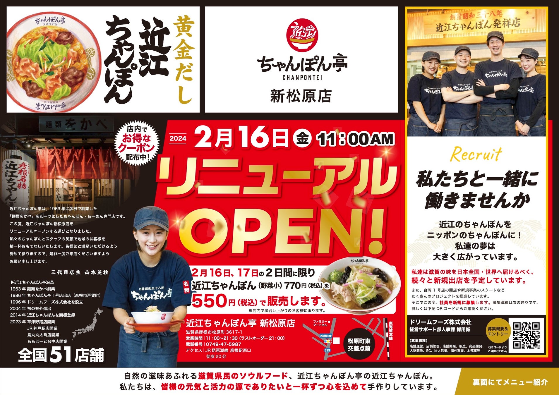 「近江ちゃんぽんをニッポンのちゃんぽんに!」をブランドビジョンに、「近江ちゃんぽん亭(以下同店という)」を展開するドリームフーズ株式会社(滋賀県彦根市 代表取締役 山本英柱、以下同社という)は、「近江ちゃんぽん亭 新松原店」が2024年2月16日(金)からリニューアルオープンします。