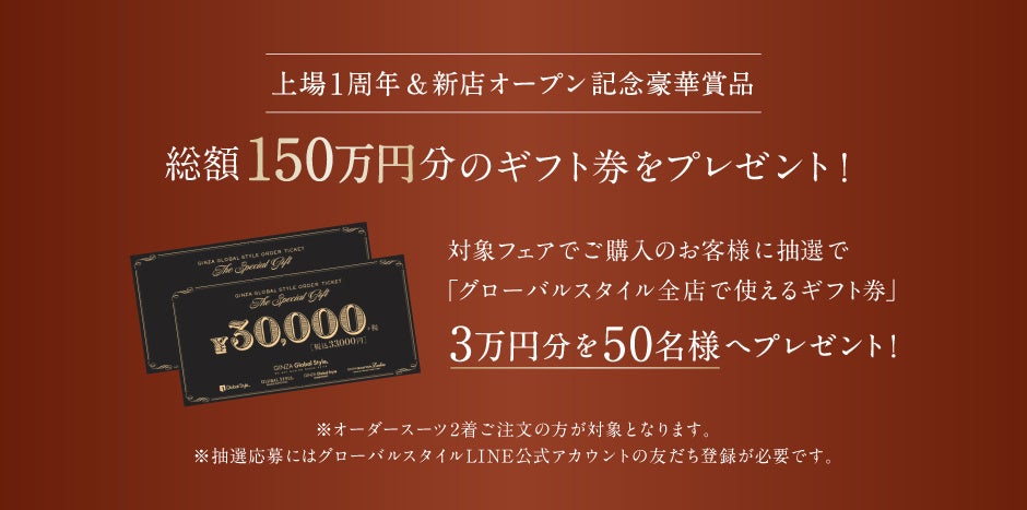 グローバルスタイル株式会社の東京証券取引所・スタンダード市場への新規上場1周年及び、3店舗の新店オープンを記念して、オーダースーツ専門店「GINZAグローバルスタイル」では2022年8月24日~10月2日まで<総額150万円分>ギフト券が抽選で当たる【新規上場1周年&新店オープン記念フェア】を開催いたします!