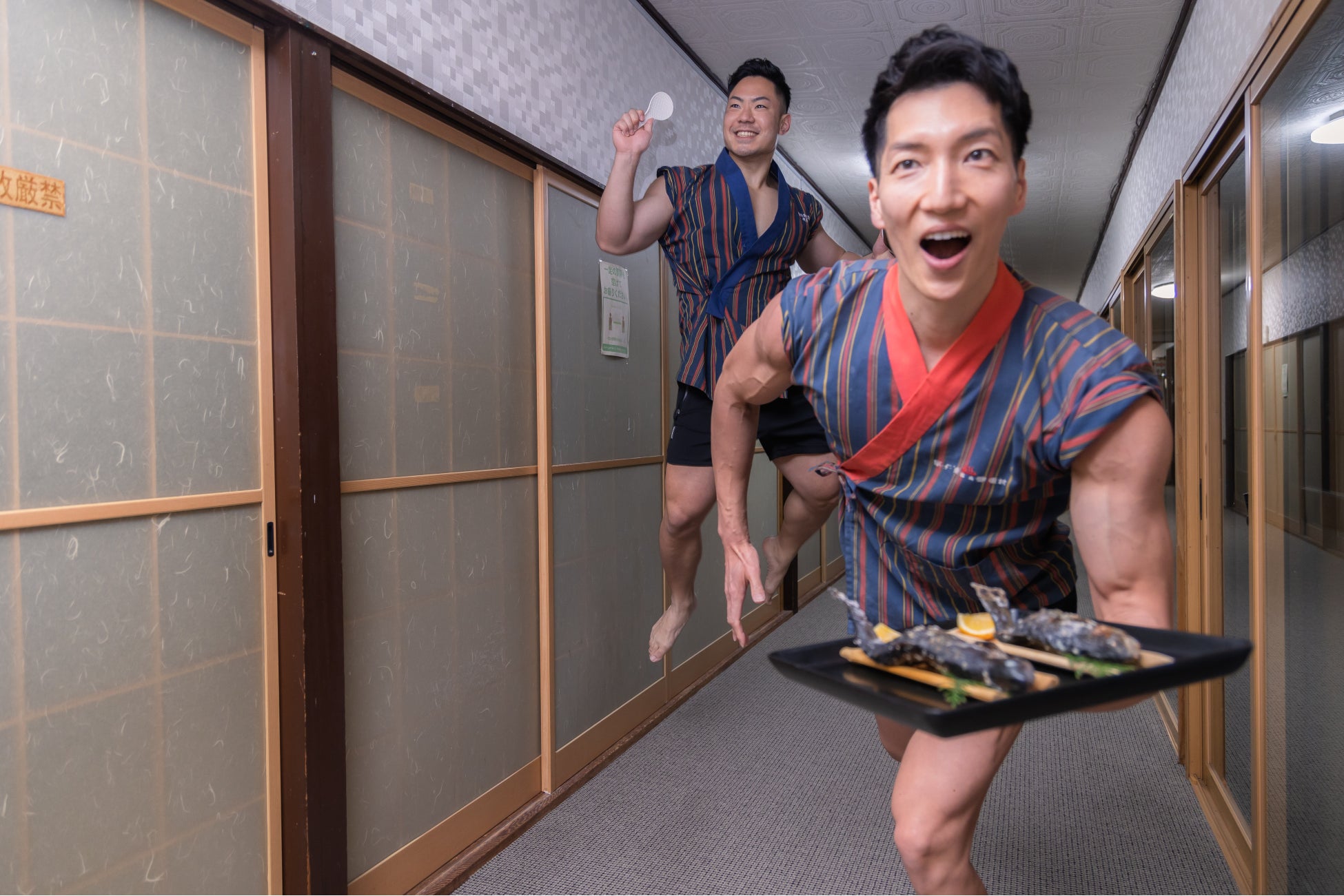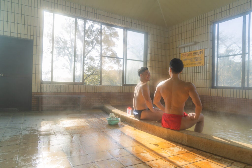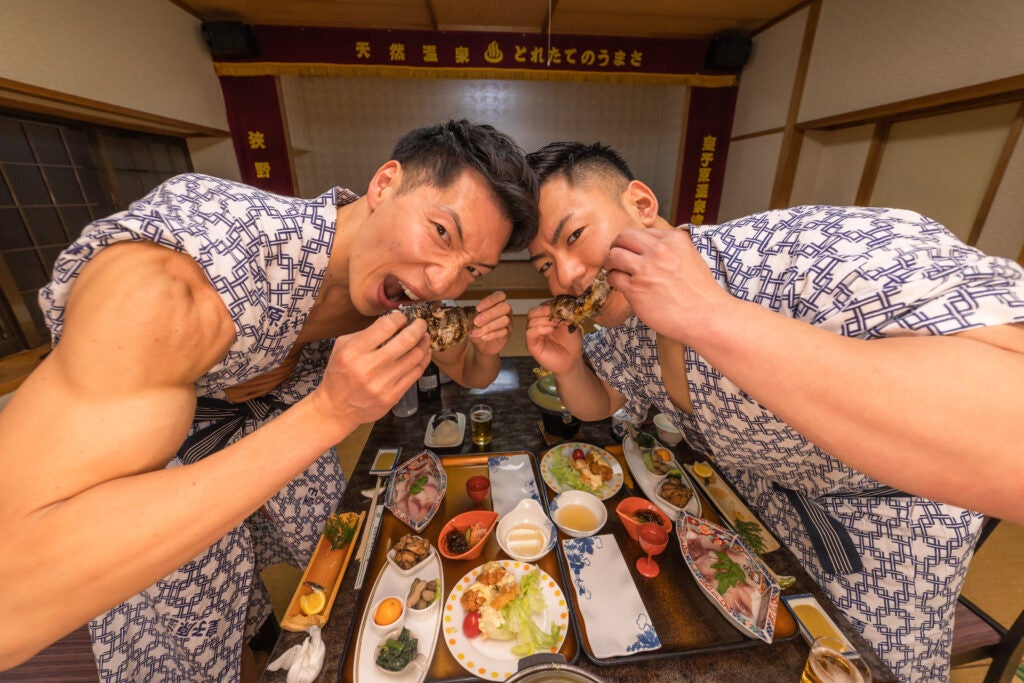 「使う用途ないけど面白い」とSNSやメディアで話題のマッチョのフリー素材・ストックフォトサイト「マッスルプラス」。宮崎県高原町の「皇子原温泉」でくつろぐマッチョや仲居のマッチョたちのフリー素材を撮影しました。