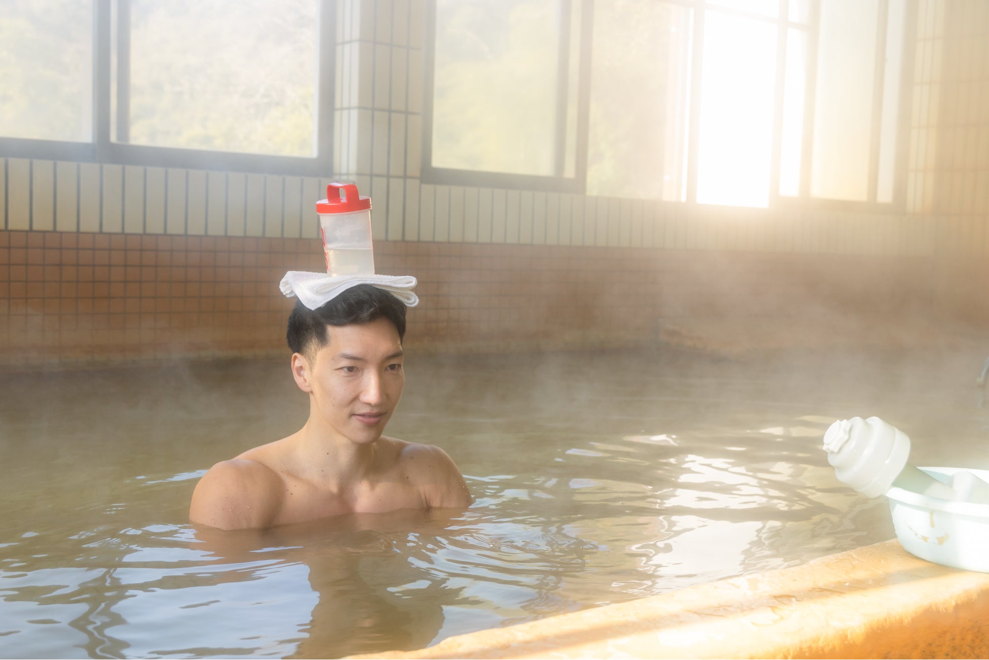 「温泉でゆっくり疲れを癒すマッチョ」