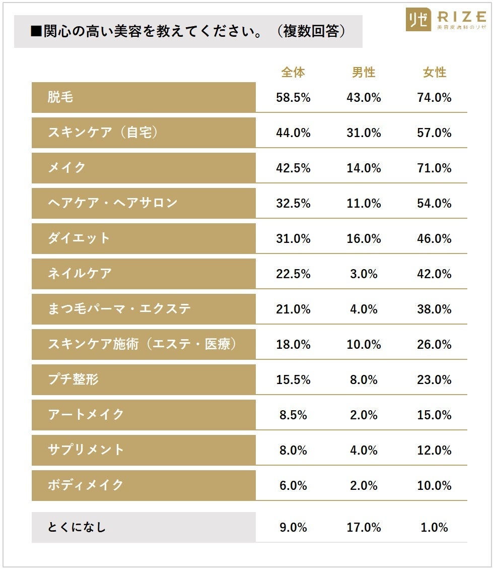 ■①【現役高校生が、いま最も関心が高い「美容」とは?】男女ともトップ回答は「脱毛」(男性:43.0%・女性:74.0%)