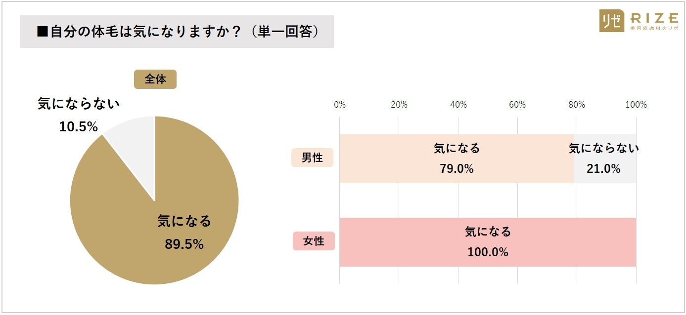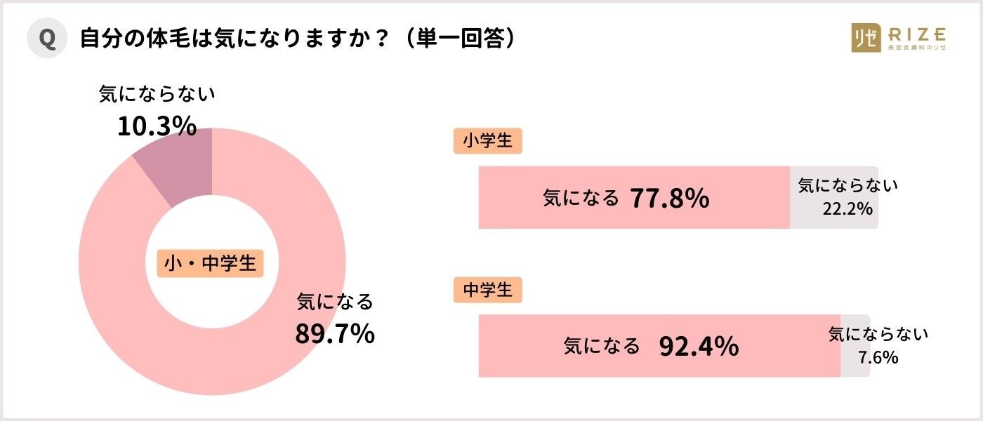 なお、当院が昨年8月に小・中学生に行った「体毛処理」に関する調査(※)では、「体毛が気になる」と小・中学生女性の9割(89.7%)が回答。小学生は8割弱(77.8%)、中学生は9割以上(92.4%)と中学生になるにつれ毛を気にする傾向があることが分かりました。