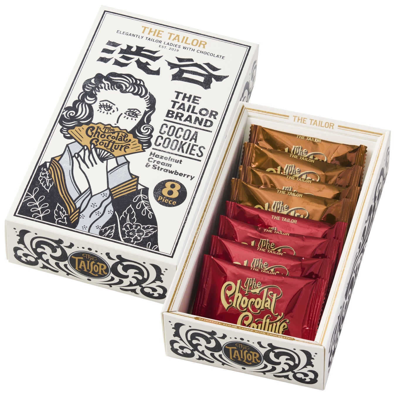 風味豊かなショコラといちごのソースをそれぞれミルクチョコレートでコーティングし、さっくりと焼き上げたココアクッキーでサンドした贅沢な味わいのショコラサンド。渋谷 東急フードショーでしか手に入らない渋谷限定のパッケージは、和装の優美な女性を描き、日本の美しさと上品さを表現した特別なデザインです。