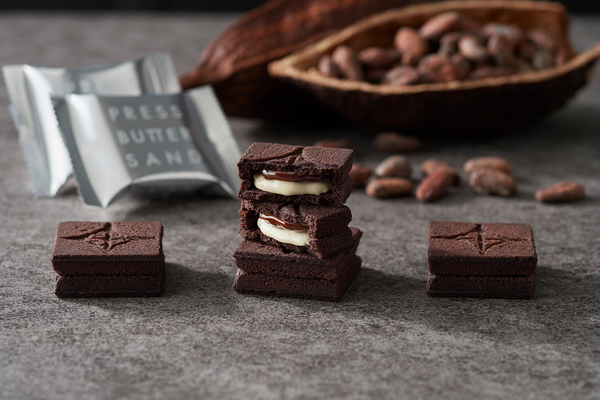 ブラックココアとレッドココアを練り込んだブラックカラーのクッキーに、なめらかなバタークリームと、厳選したコロンビア産チョコレート2種をラム酒で香りづけしたチョコレートキャラメルの2層を挟み込んだサクサク食感のバターサンドです。ココアのほんのりビターな味わいとチョコレートのほどよい甘さのコントラストをお楽しみいただけます。