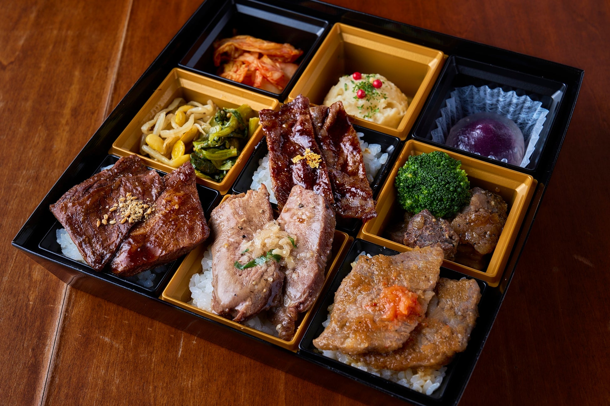 焼肉の定番のタン、カルビ、ロース、ハラミ、さらにステーキの5種類の厳選牛肉を一度に味わえる豪華なお弁当。ナムルとキムチ、ポテトサラダの副菜3種類と甘味まで、たっぷりとお楽しみいただけます。