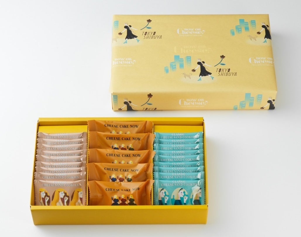 カマンベールチーズとエダムチーズにほんのりレモンを効かせて仕上げた「チーズケーキナウ カマンベール&エダム」と、チーズの風味をしっかりと感じる定番商品クラシックチーズサンド2種、計3種を詰め合わせました。渋谷の街並みとモチーフを使った、限定デザインの包装紙でお包みします。