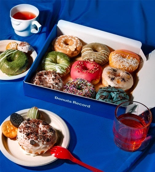 レコードのようなドーナツは、国産小麦と米油を使用した、軽やかで風味豊かな生地を彩る12種類のフレーバーがラインナップ。それぞれに曲名がつけられているので、まるでオリジナルプレイリストを作るように、お気に入りの9曲をBOXにセレクトし、みんなでシェアしてお楽しみいただけます。