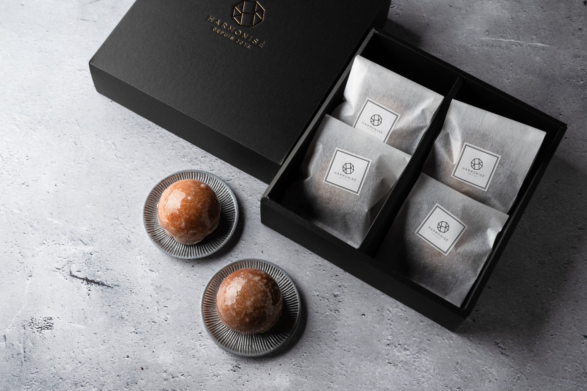 滋賀県産もち米を使用し、薄く焼き上げたサクサクのもなか種に、琥珀色の甘じょっばいみたらし餡を挟むスタイリッシュなドーナツ型の合わせもなか。もなかと餡が個別包装されているので、いつでもサクサクの食感を楽しんでいただけます。