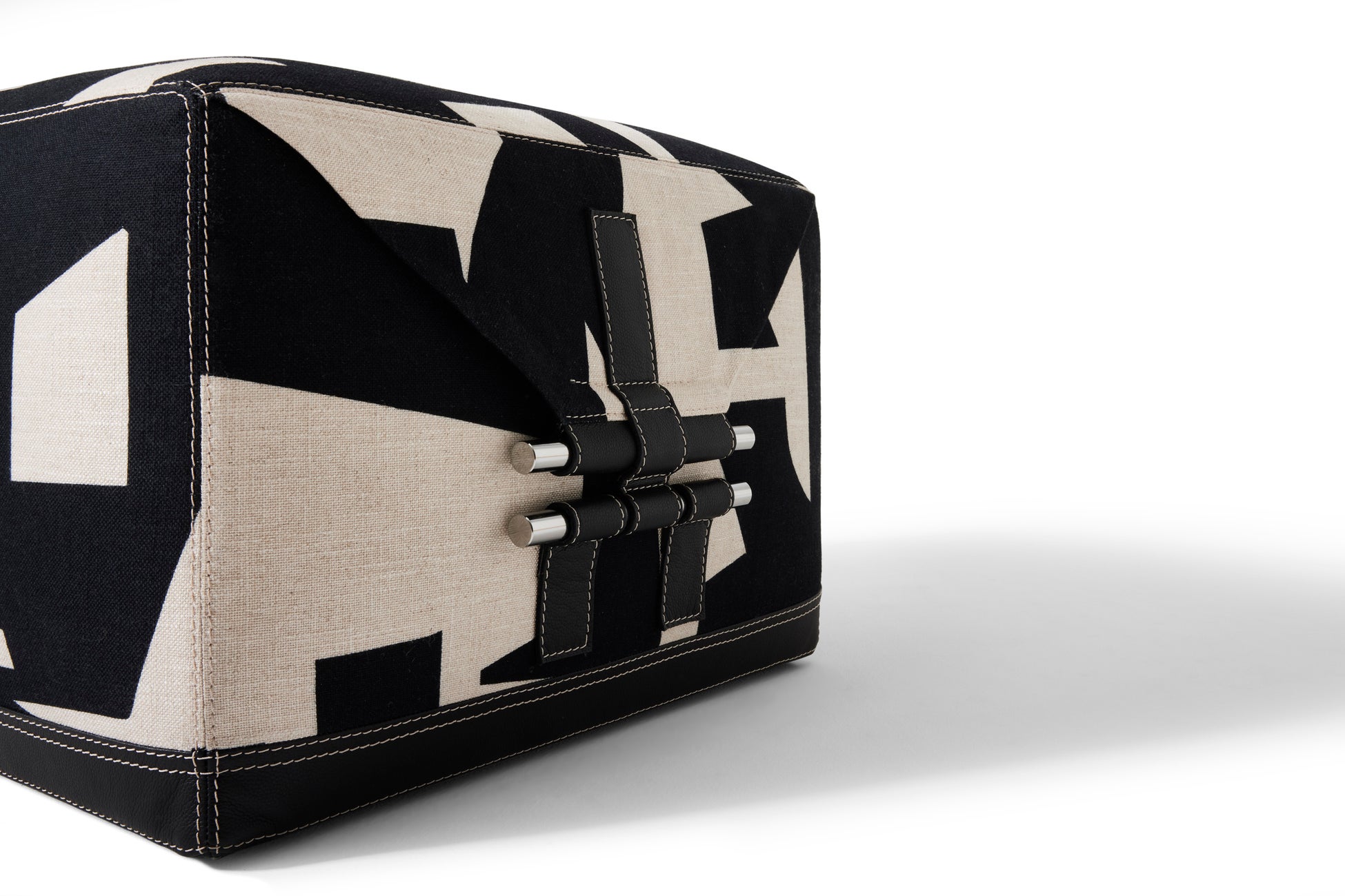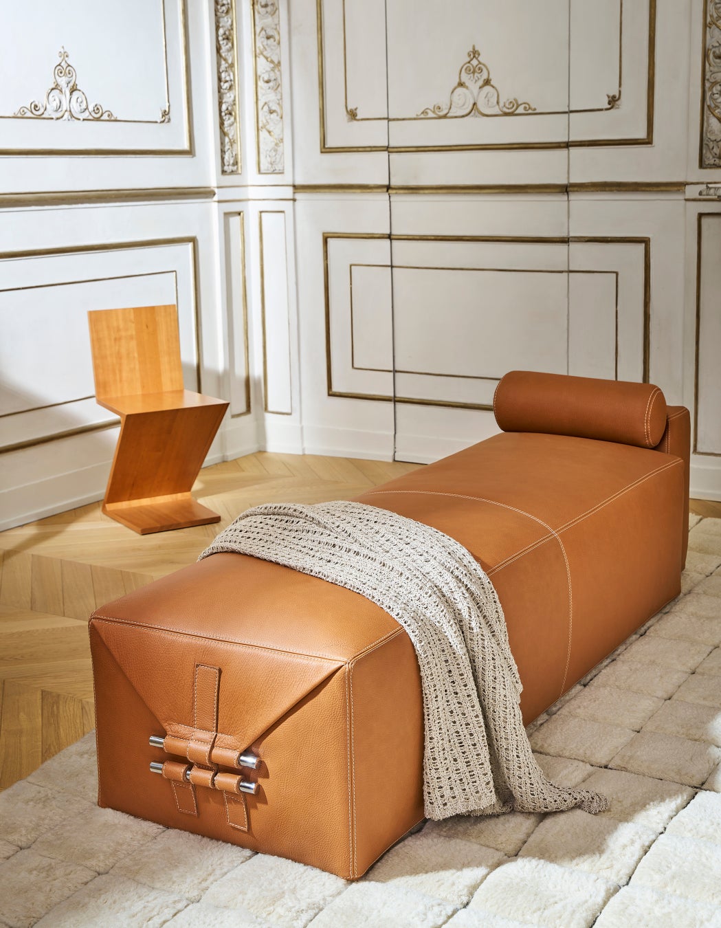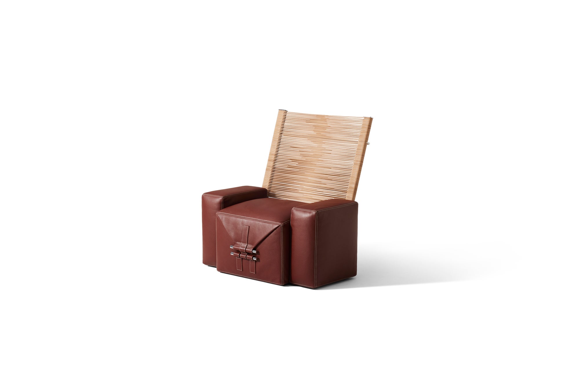 3つのオットマン(正方形2種/長方形1種)とアームチェアから成る機能的なこれらのモデルは、馬具や革細工の世界からインスピレーションを得ています。バッグやスーツケース、包装紙に包まれたギフトなど、さまざまなものを連想させる非常に洗練された職人技による包み方が特徴で、メタルパーツで装飾されています。居心地の良いアームチェアは、手編みの天然サドルレザーを使用した背もたれが職人技を感じさせ、より快適で理想的なくつろぎを提供するデザインです。