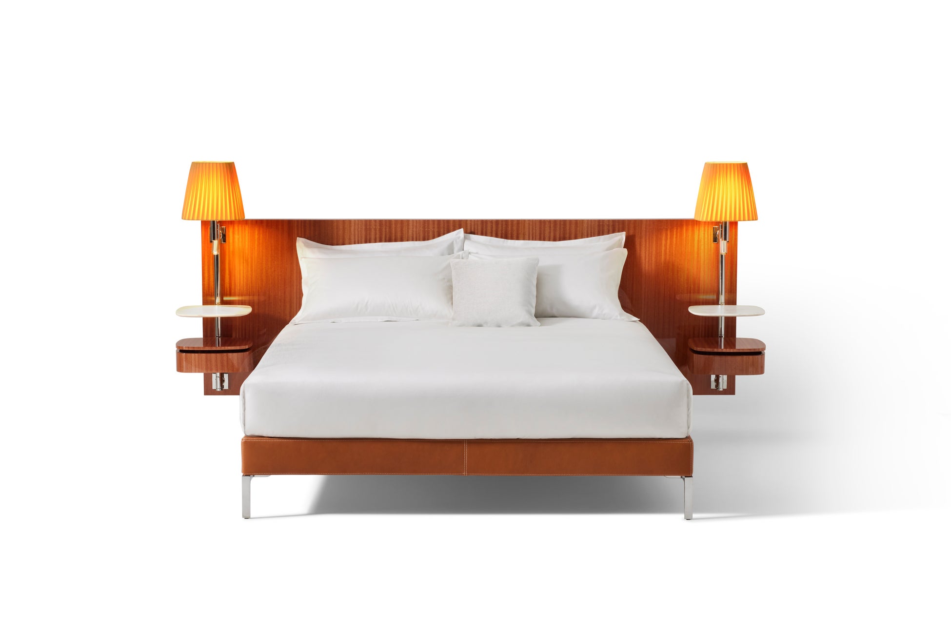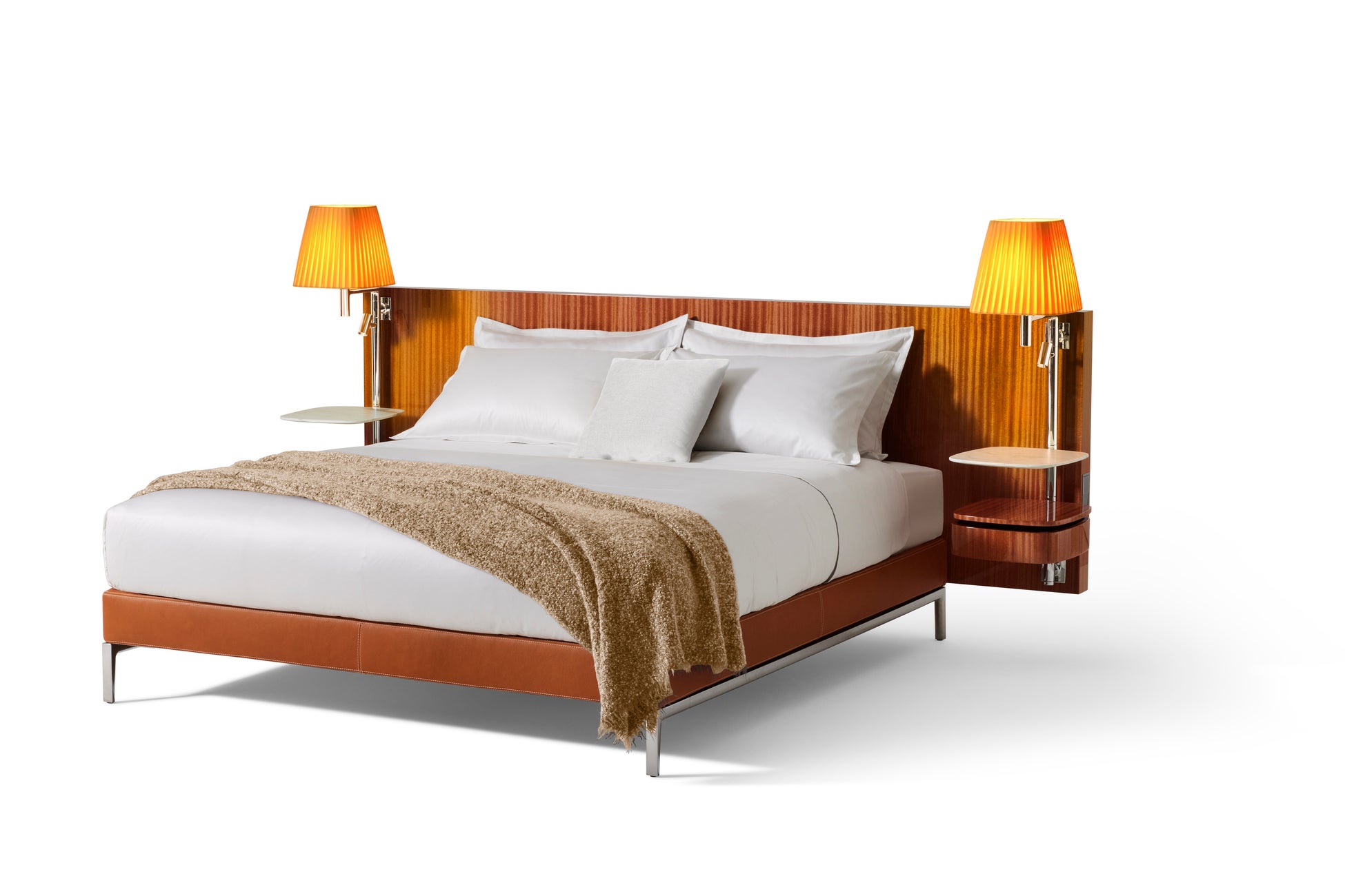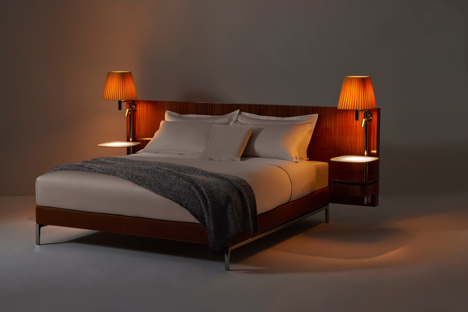 ヘッドボードの両側には、機能的なアクセサリーを豊富に取り揃えたアルミニウム製のバーが取り付けられています。 大きなファブリックのシェードは暖かく柔らかな光を拡散し、調光可能な小さなLEDスポットライトは読書用に使用できます。便利なアイテムを手近に置いておけるよう、吊り下げ式のベッドサイドテーブル2台には、大理石の天板とヘッドボードと同仕上げの木製ドロワーが付いています。