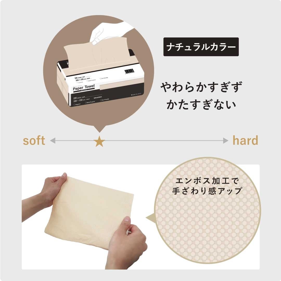 引き出す際の引っ張りの強さは他社のペーパータオルハード品と遜色なく、自然の「木」本来のナチュラルカラーとやわらかすぎずかたすぎない触り心地が特徴です。