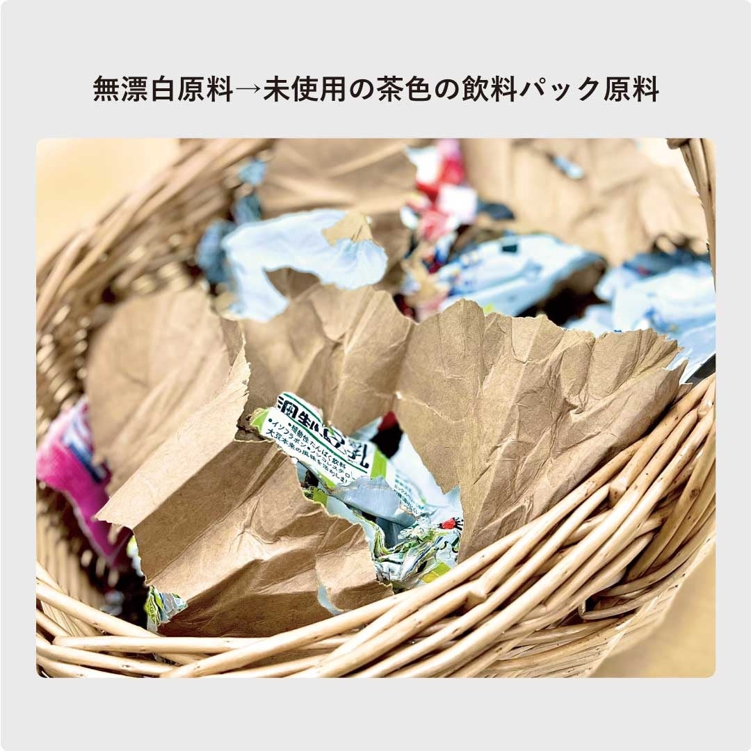 飲料容器メーカーの製造工程で発生した未使用の茶色の飲料パックを原料の一部に使用しています。