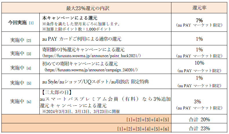 キャンペーン期間中にエントリーの上、au PAY カードを利用してau PAY ふるさと納税で寄附いただくと、寄附額に対して最大7%のPontaポイント(au PAY マーケット限定)を還元します。実施中の各キャンペーンや特典とあわせると合計最大23%のポイントを還元します。