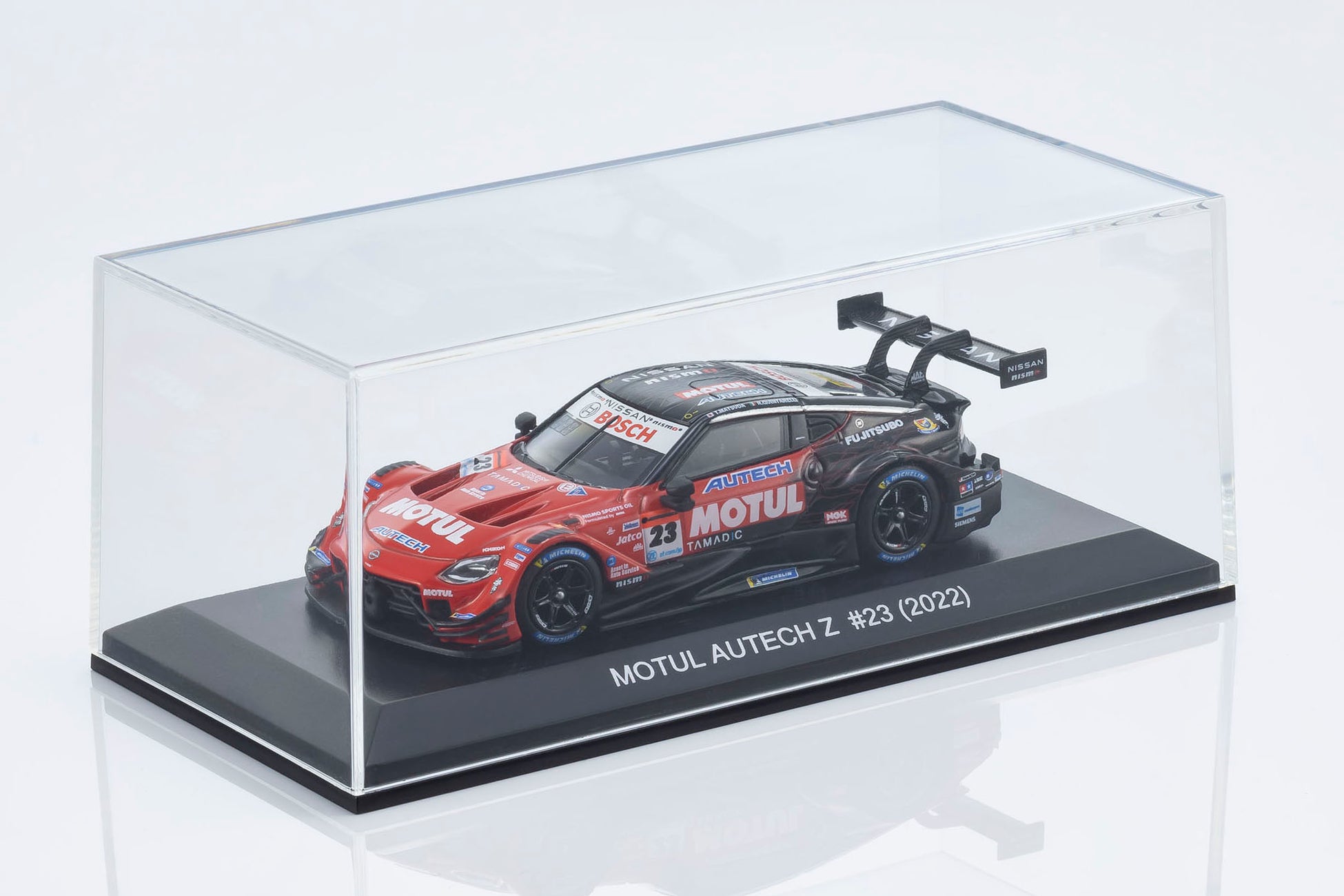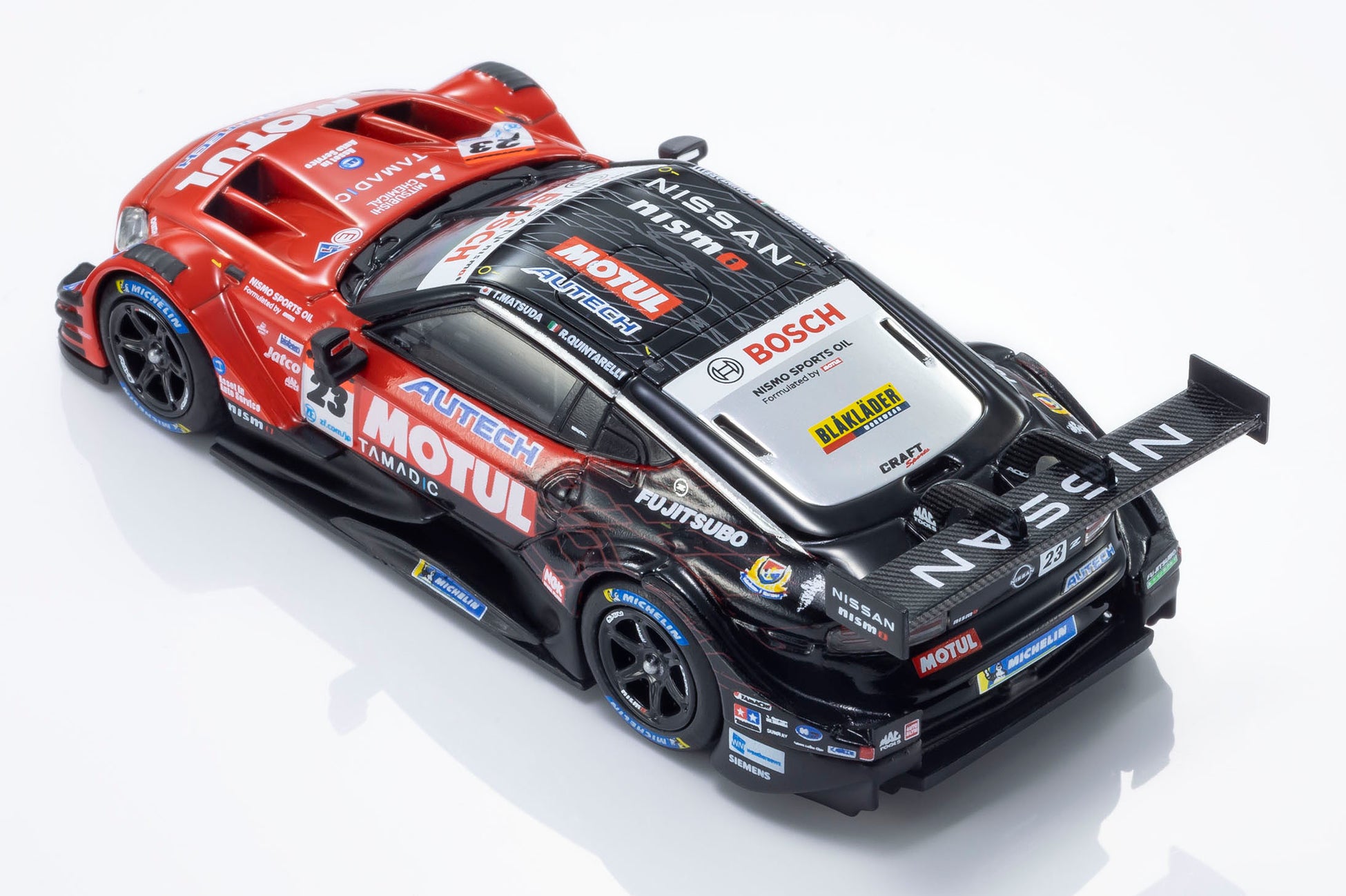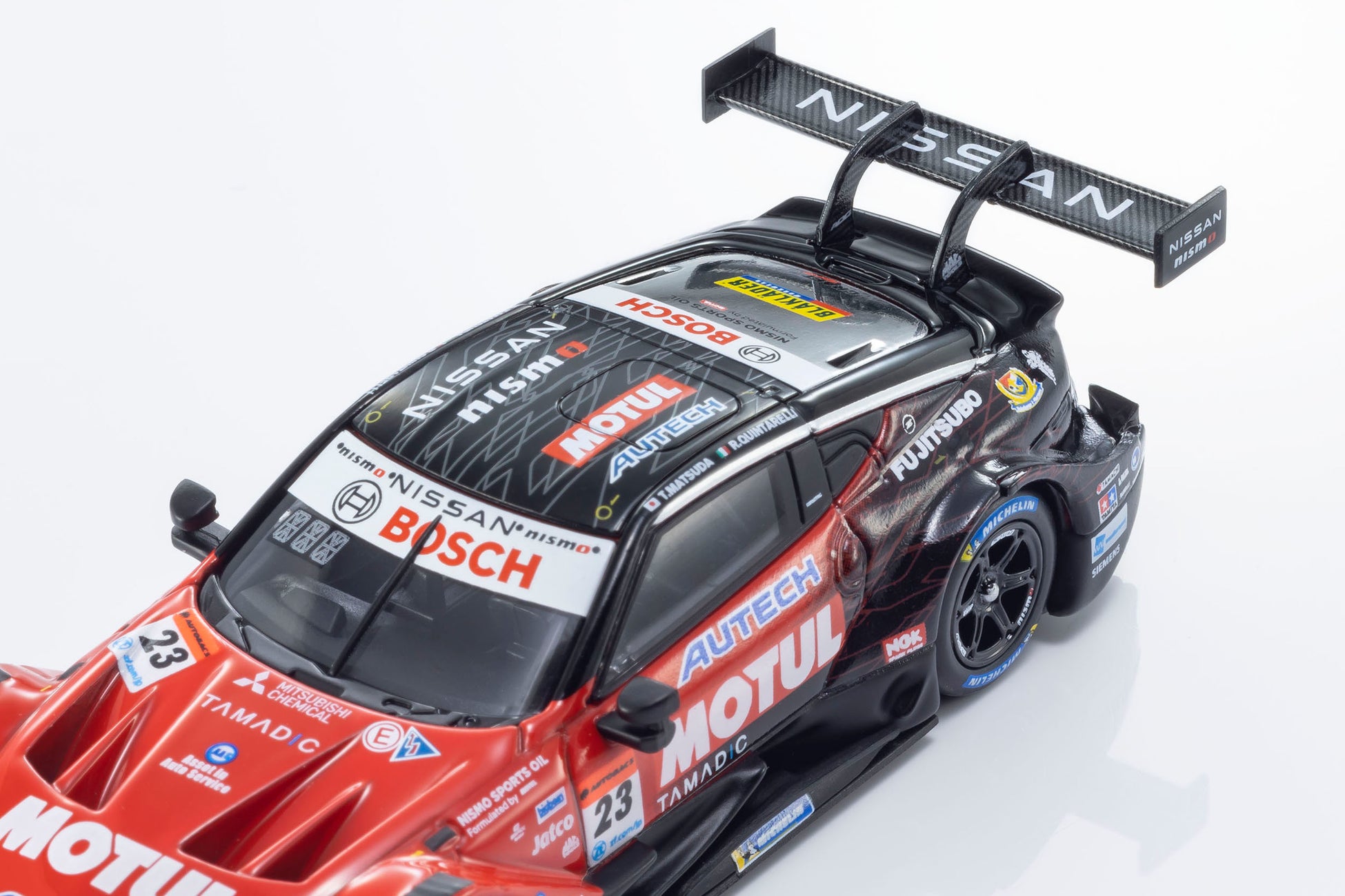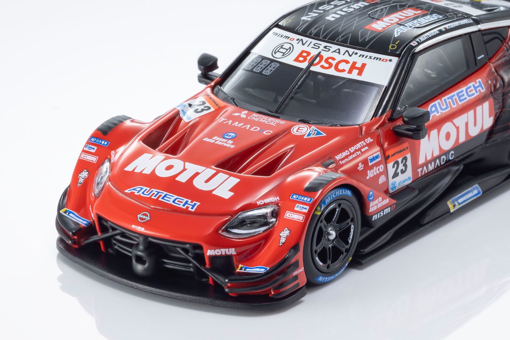 日産陣営の中心となるMOTUL AUTECH Z #23は、必勝を期して松田次生/ロニー・クインタレッリという強力なドライバーラインナップで挑んだものの、惜しくもチャンピオンを獲得することはできませんでした。しかし、復活のメモリアルイヤーを戦ったエースナンバー車両としてモデル化を決定。サーキットでのアツい走りが目に浮かぶような仕上がりになっています。