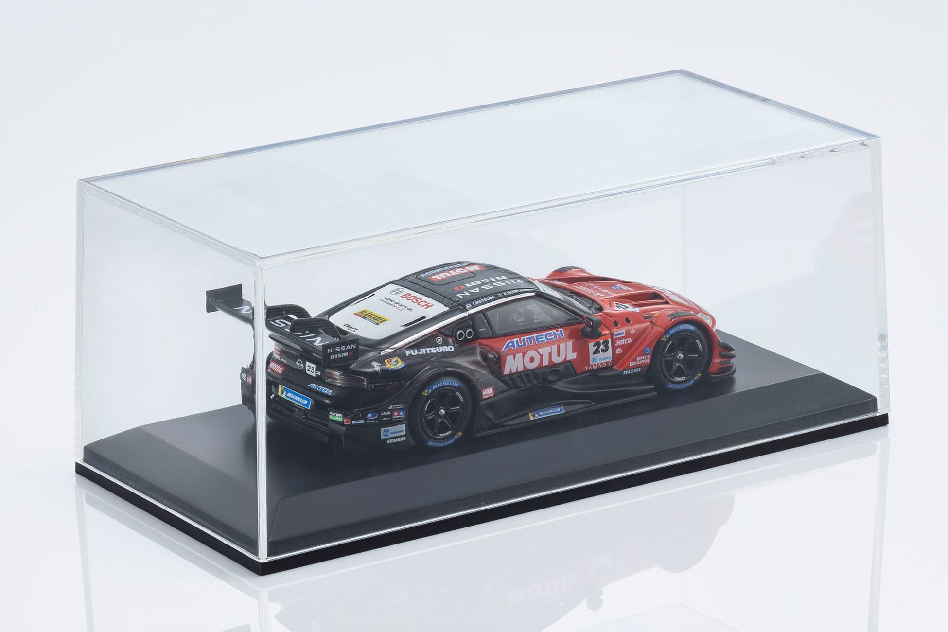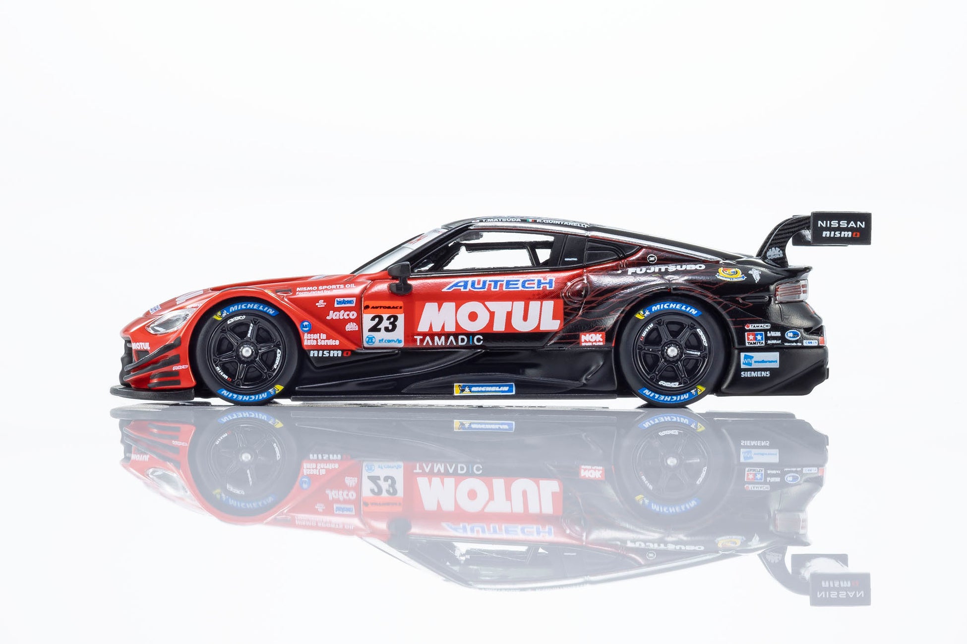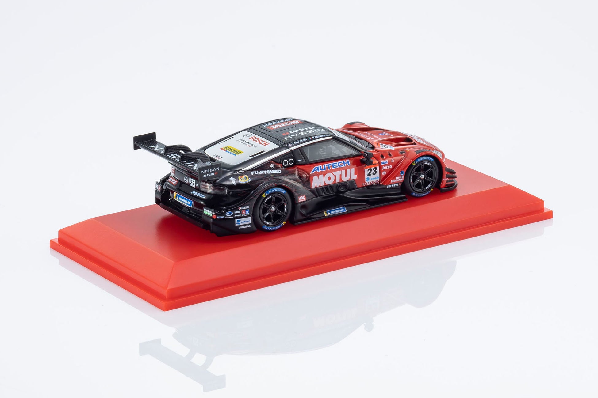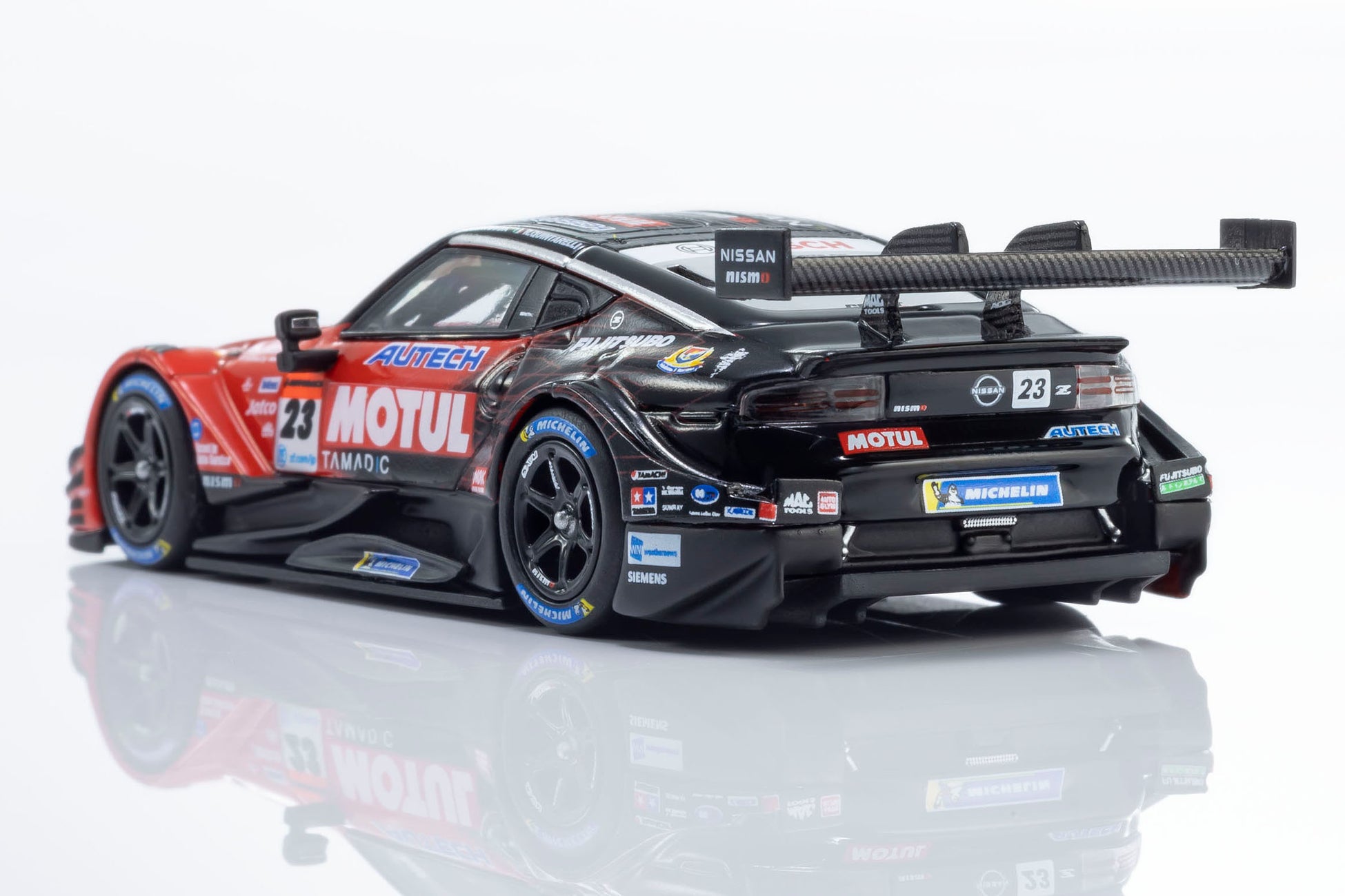 日産陣営の中心となるMOTUL AUTECH Z #23は、必勝を期して松田次生/ロニー・クインタレッリという強力なドライバーラインナップで挑んだものの、惜しくもチャンピオンを獲得することはできませんでした。しかし、復活のメモリアルイヤーを戦ったエースナンバー車両としてモデル化を決定。サーキットでのアツい走りが目に浮かぶような仕上がりになっています。