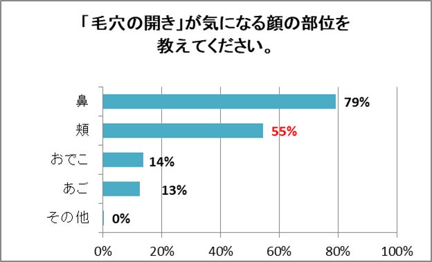 さらに、「毛穴の開き」で最も気になる部位は「鼻」が第1位、次いで「頬」が第2位という結果に。