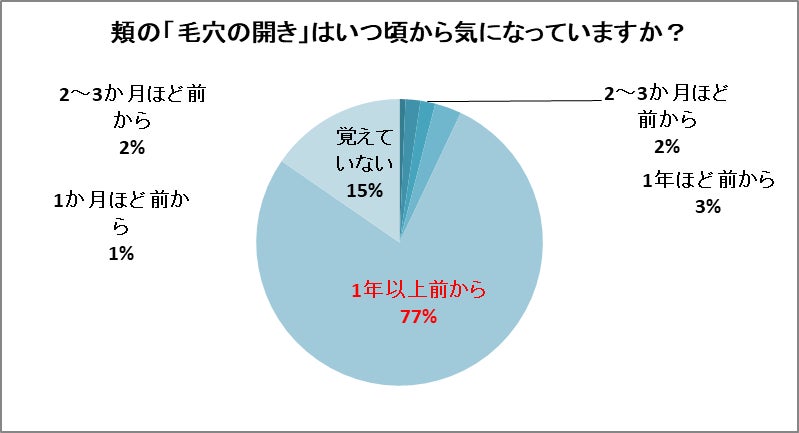 また、頬の「毛穴の開き」は、1年以上前から気になっていると回答している人が77%となっており、