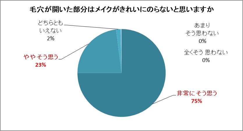 毛穴が開いた部分はメイクがきれいにのらないと回答した人は、「非常にそう思う」「そう思う」を併せると、なんと98%という結果に。毛穴の開きがベースメイクの仕上がりの満足度を左右することがわかりました。