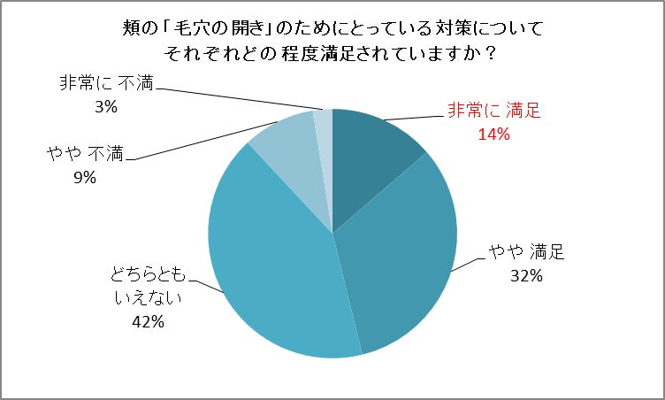 一方で、残りの5%は対策をしていますが、対策の一つとして「保湿力のあるスキンケアを使用すること」と回答した人に聞いたところ、その対策における「非常に満足」と回答した方は約14%となっており、対策をしていても満足度は低いことがわかりました。