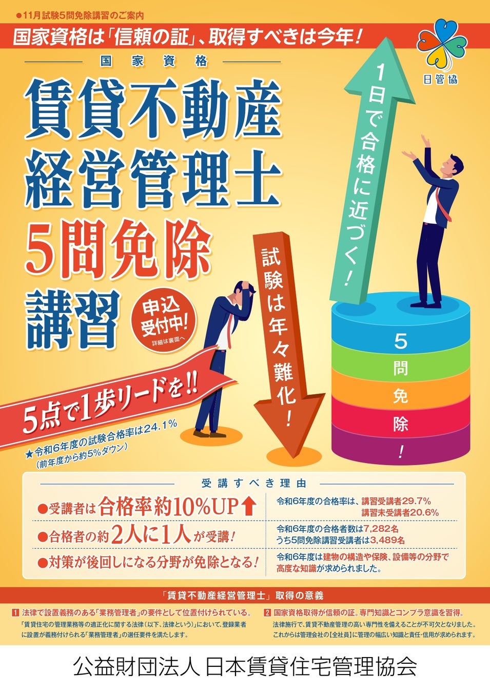 公益財団法人日本賃貸住宅管理協会(本部:東京都千代田区、会長:塩見紀昭)は、令和7年度賃貸不動産経営管理士試験に向けた「賃貸不動産経営管理士5問免除講習」(以下:5問免除講習)の受講申込みを4月24日(木)より開始します。