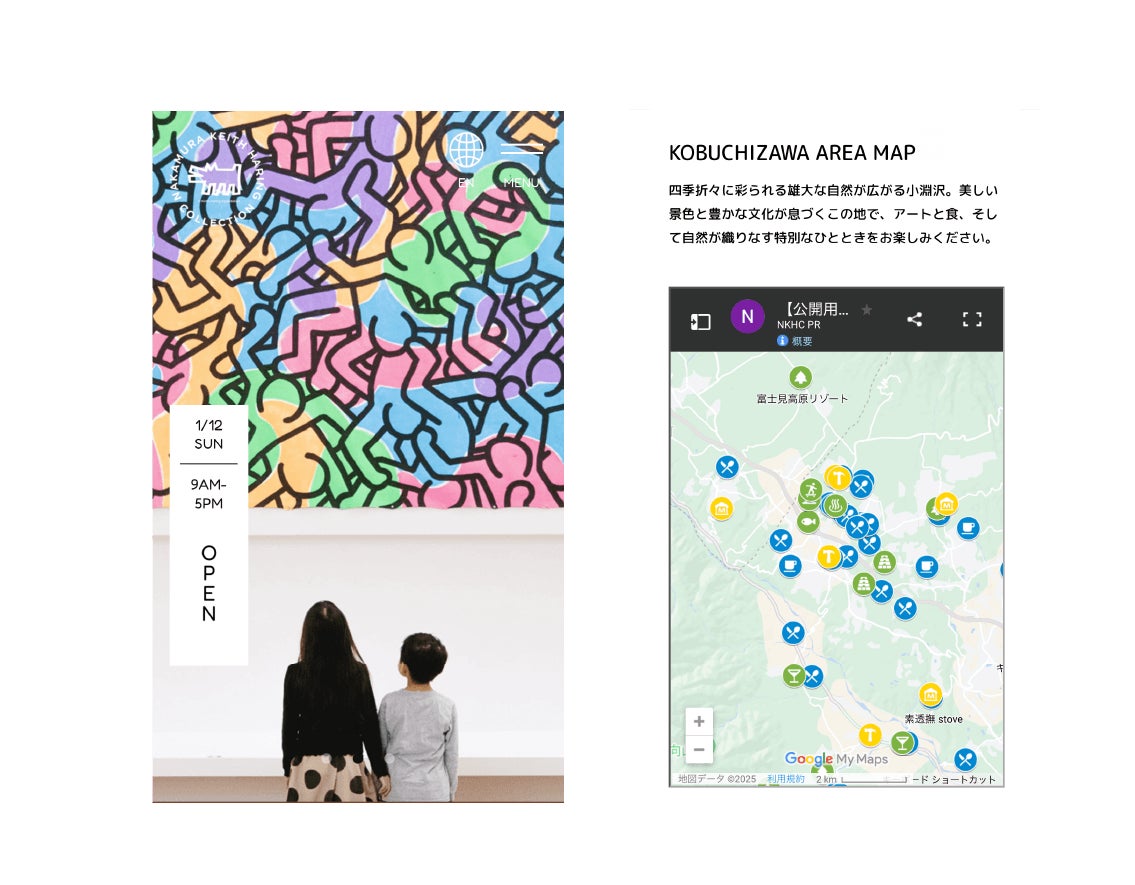 新サイトではトップ画面に開休館が一目でわかるバナーを設置。また「FAQ(よくある質問)」を設け、来館者が事前に必要な情報を簡単に確認できるようになりました。さらに、地域の魅力を紹介する「NATURE」ページを新設。当館に隣接する森の散策路をご案内するとともに、地元の食、自然、文化を「KOBUCHIZAWA AREA MAP」でご覧いただき、当館への訪問をきっかけに地域全体を楽しんでいただけるよう情報を発信します。