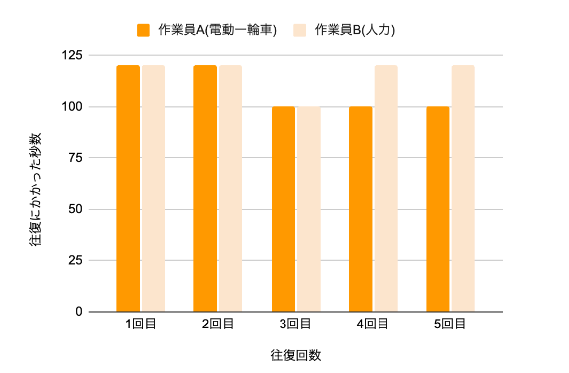 効率の向上: 電動一輪車を使用した作業員Aは、往復回数が増えるにつれて作業効率が向上し、3回目以降は人力の作業員Bに比べて16.7%の時間短縮、267kg分の土砂の運搬効率化に繋がりました。これは、電動一輪車が疲労軽減に寄与し、効率的な作業を可能にすることを示しています。