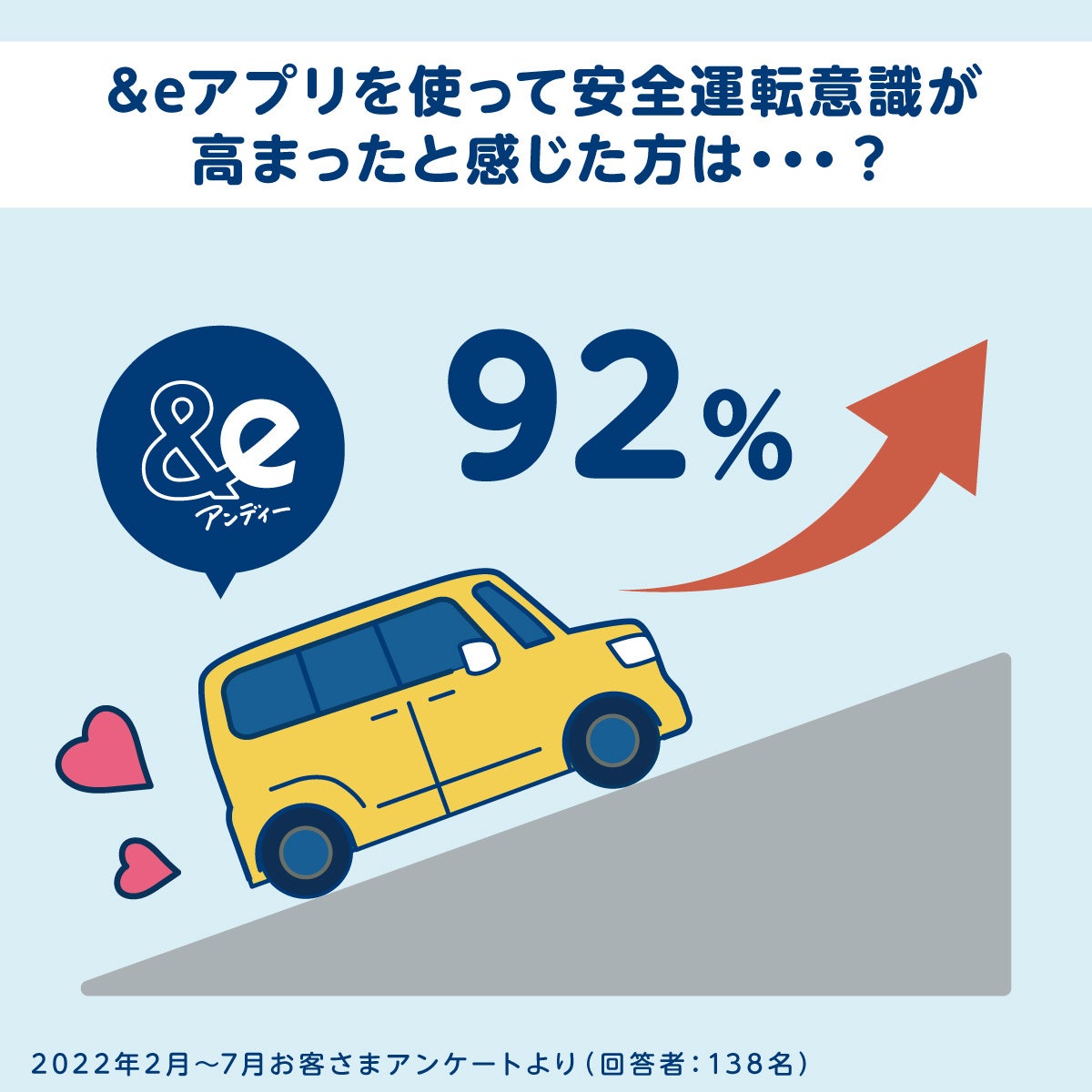 お客さま向けに行ったアンケートでは、「&eのアプリによって安全運転意識が高まった」と回答した方が92%となり、アプリ内で①Tripレポートの振り返り②運転テーマを確認することで、安全運転に対する意識の変化が見られることが確認できました。
