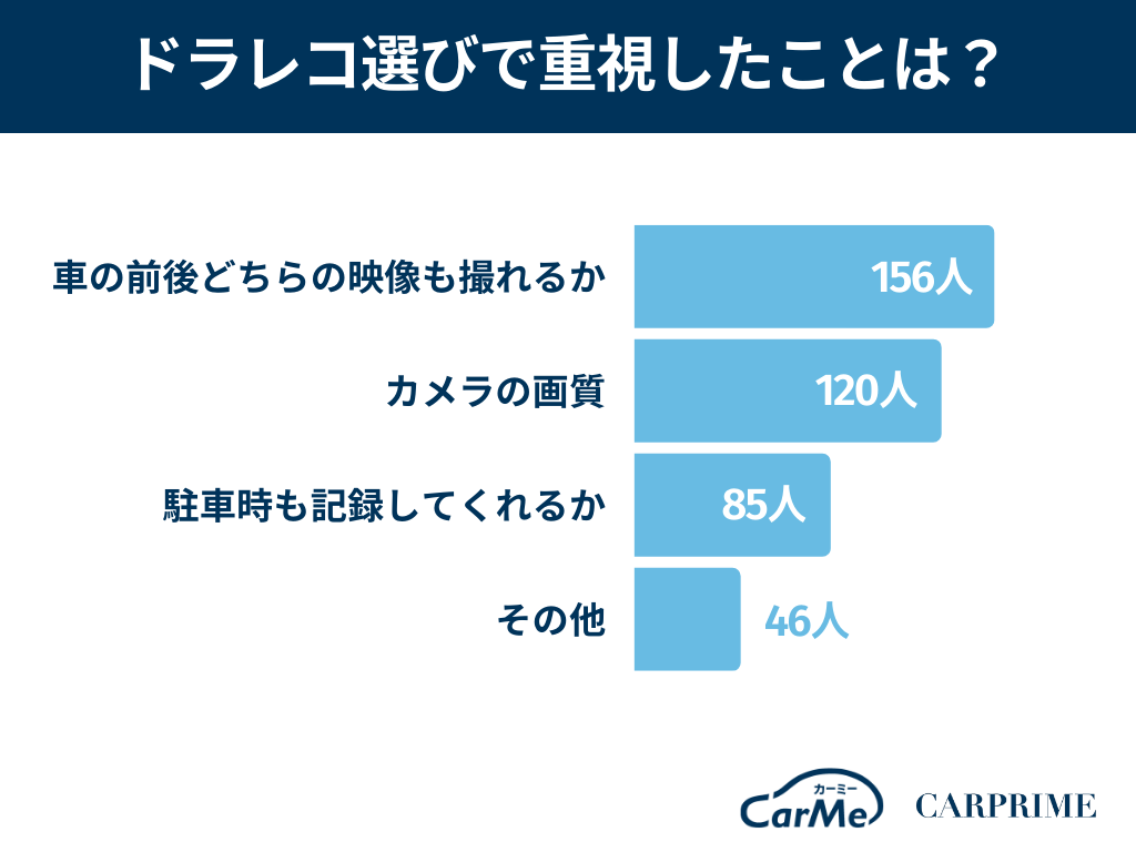 また、120名(40%)の方はカメラの画質も重視していました。画質が高くないとあおり運転を受けた時に証拠にならない可能性があると考えられているからでしょう。