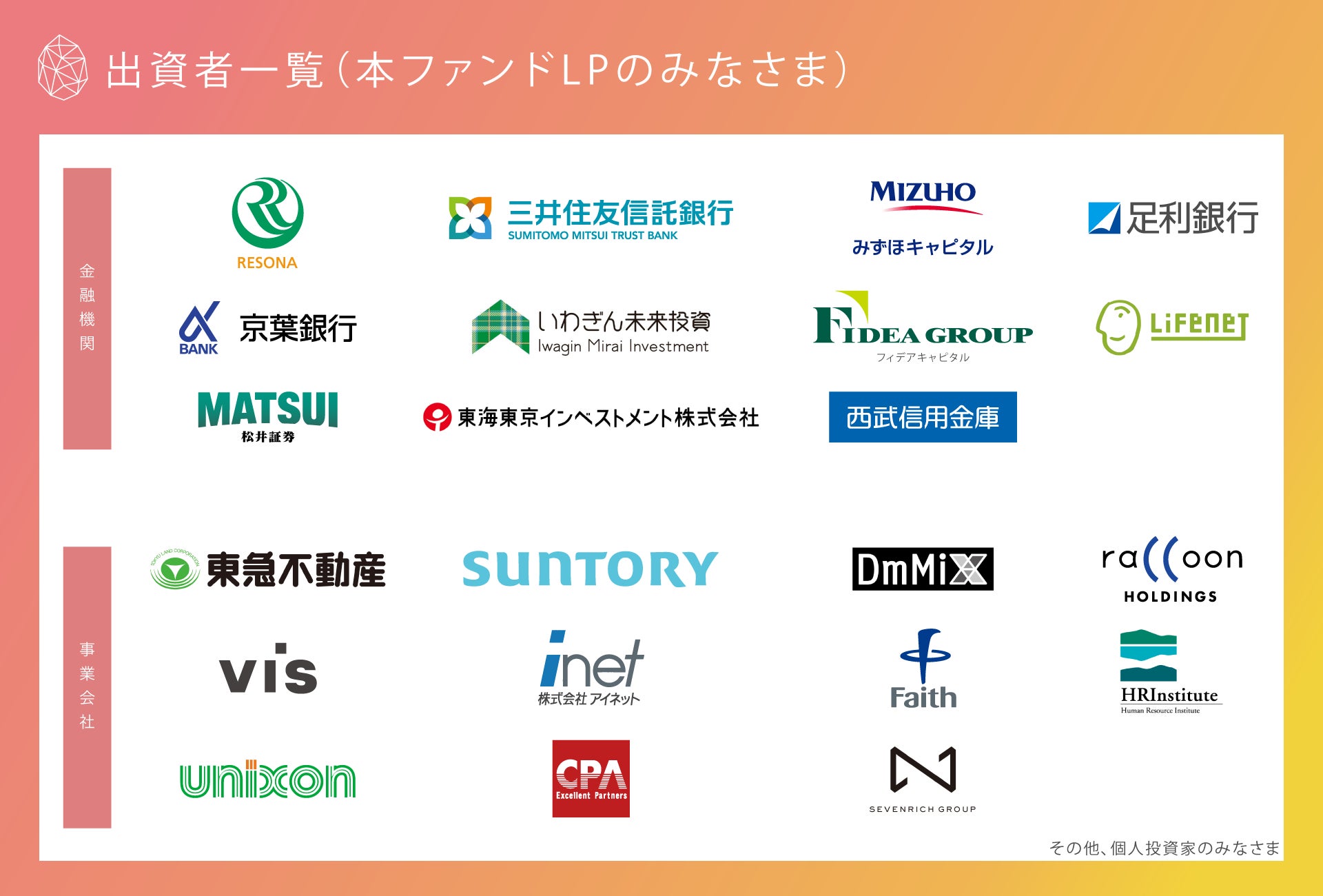 金融機関11社、事業会社11社、その他個人投資家8名のみなさまにご参画いただき、既に国内外多数のスタートアップへの投資も開始しています。