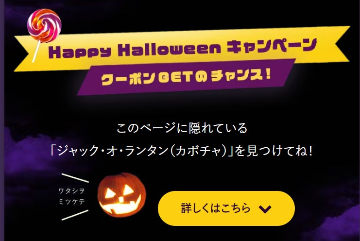 ハロウィン特設ページに隠れている「ジャック・オ・ランタン」を見つけて、クーポンをGETしてね。