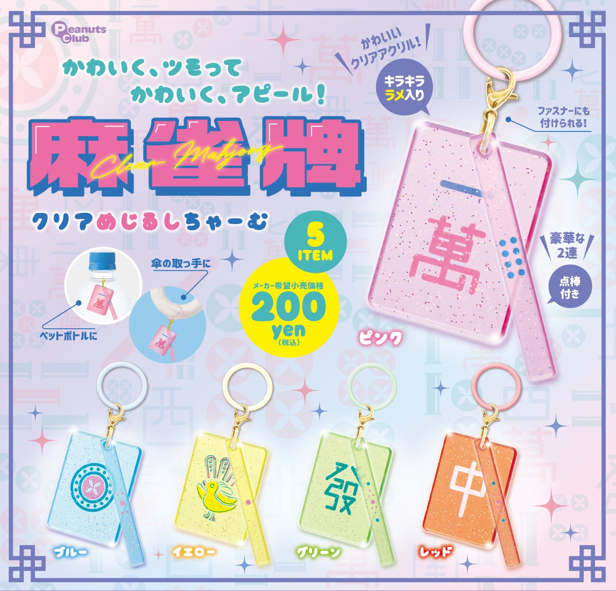株式会社ピーナッツ・クラブ(本社・大阪府東大阪市、代表取締役社長・前田泰裕)は、カプセルトイの新製品『麻雀牌 クリアめじるしちゃーむ』を2025年1月23日より順次、全国のカプセルトイ売場で販売します。全5種、1回200円(税込)。