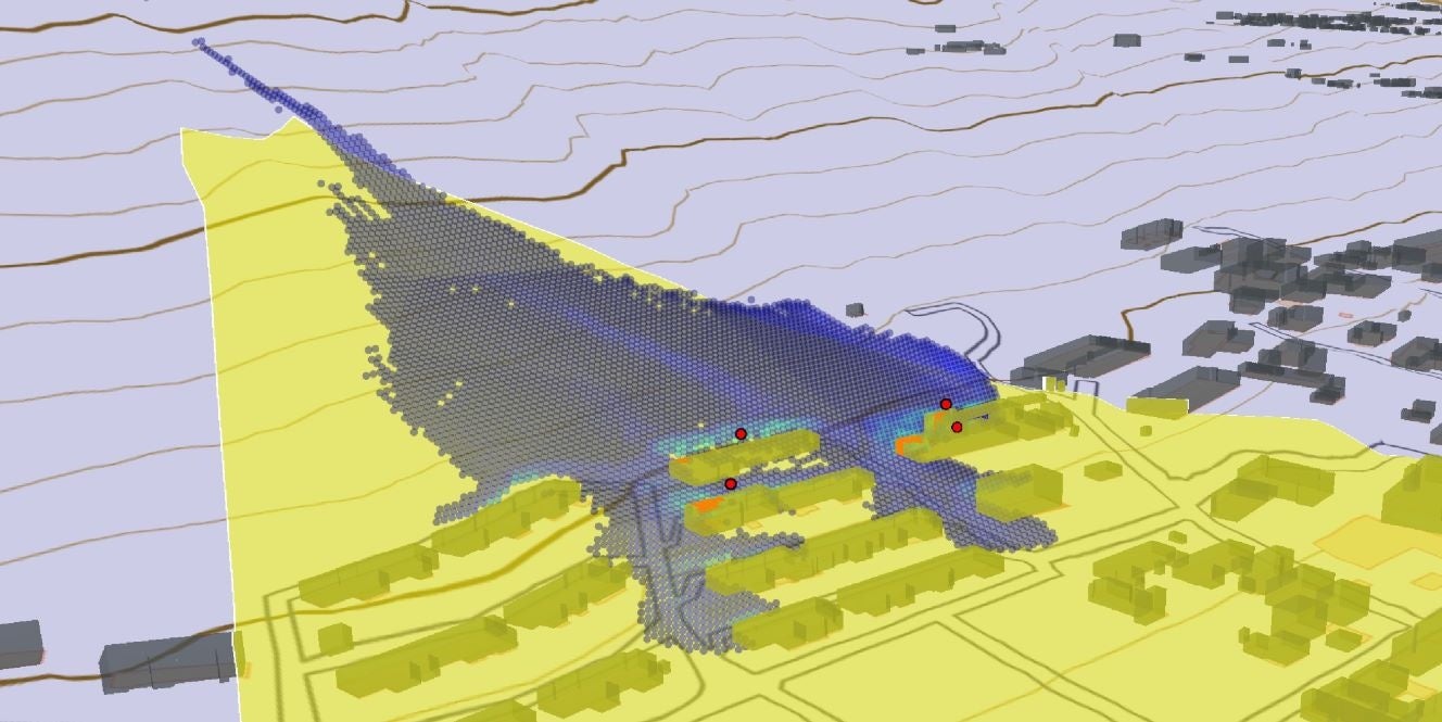 今回、「Project PLATEAU」で整備された3D都市モデルを用いることで、土石流等が家屋に衝突することによってもたらされる、エネルギーや流動方向の変化を考慮した土石流シミュレーションが実施できるようになりました。これにより、家屋の倒壊等を考慮した形で土石流の氾濫範囲を緻密に解析し、比較的リスクの低い地点等を工学的根拠に基づいて示すことが可能となります。