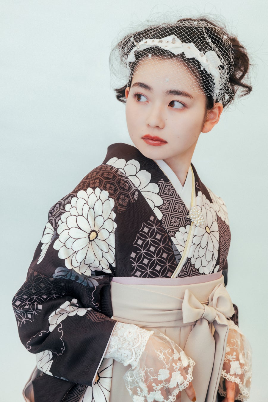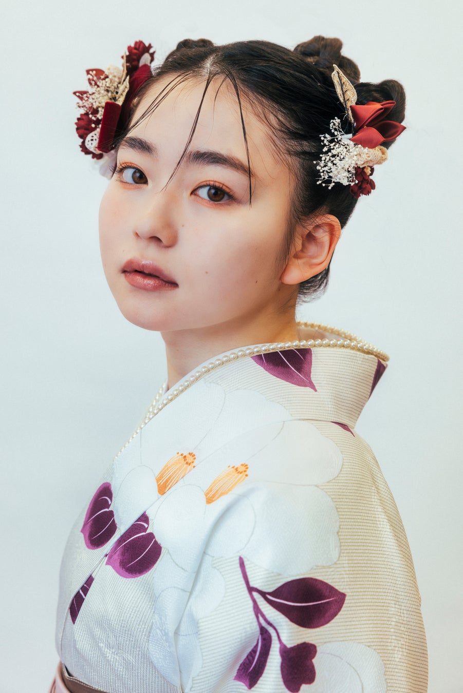 学生最後の特別な日は、華やかに彩った最高の衣装を着ていただきたいという思いを込めた、京都きもの友禅の新作袴を山田杏奈さんが可憐に着こなします。近年人気のナチュラルで淡いテイストの袴をやわらかいトーンでまとめたコーディネートで、トレンド感のある仕上がりになっています。新たに5種類の袴が追加され、カラー展開もより豊富になり、コーディネートの幅も広がりました。また、和装の古典的な型にとらわれず、洋服のようにお好みに合わせて自由にスタイリングしていただけるよう、様々な小物を取り入れたアレンジも紹介しています。レース手袋やベレー帽など、取り入れやすいアイテムを使ったワンランク上の最旬スタイルも合わせて、ぜひご覧ください。