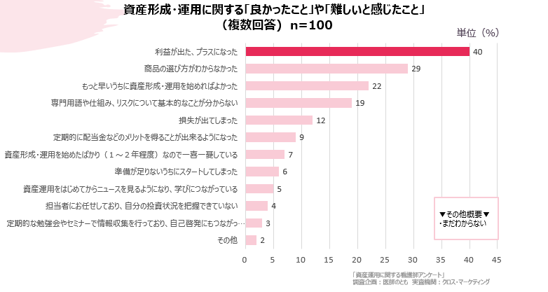 「利益が出た、プラスになった」という回答が40%を占め、一部の看護師は資産運用で成功体験を積み、