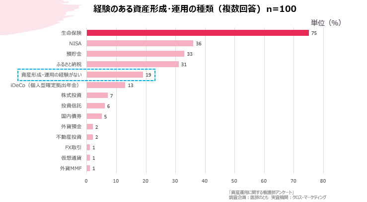 19%が「資産形成・運用の経験がない」という結果から、一部の看護師は、資産運用に不慣れで、その機会や知識を得ることが少ない可能性も伺えます。