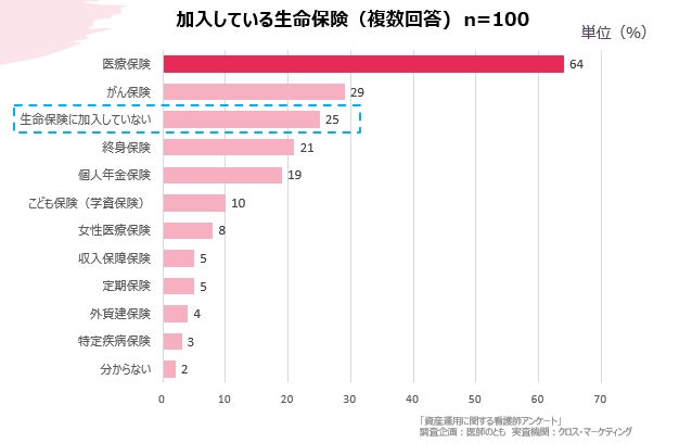 「医療保険」が64%と最も多く、看護師自身、日々、医療現場で患者のケアを行っており、病気やケガに敏感で、健康への意識が高く、自身や家族の健康に備えるために医療保険へ加入している傾向が伺えます。また、重症な疾患リスクにも意識が高く、医療費や治療に伴う経済的な負担の面から、「がん保険」への理解やその必要性に寄与していることも伺えます。