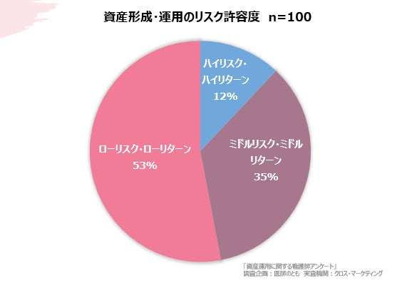 「ミドルリスク・ミドルリターン」が35%と、リスクを取りつつも、バランスを重視した中程度の投資を検討していることが伺えます。また、「ハイリスク・ハイリターン」は12%という結果から、看護師として安定した職業に従事している一方で、将来への不安やリタイアメントへの備えとして、積極的な資産形成を望んでいる層が一定数いることが伺えます。