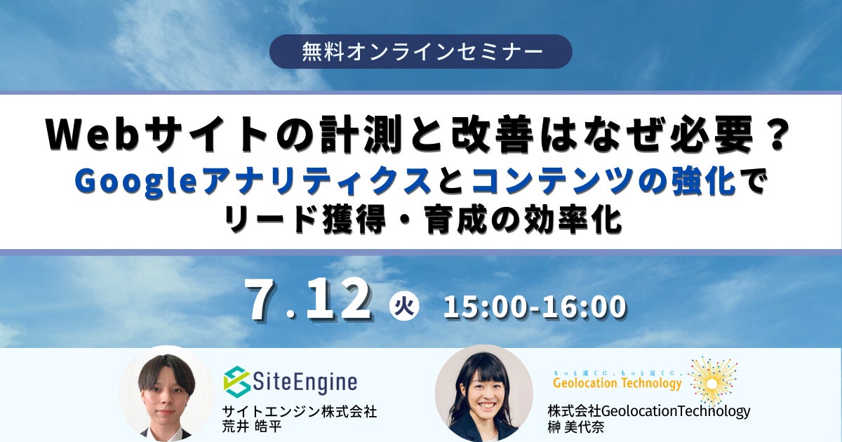 「改善のタネを広める」を経営理念としてWebマーケティング支援サービスを提供するサイトエンジン株式会社(本社:東京都世田谷区 代表取締役:毛塚 智彦)は、2022年7月12日(火)15:00~16:00に、株式会社Geolocation Technology(本社:静岡県三島市 代表取締役社長:山本 敬介)との” Webサイトの計測と改善はなぜ必要? -Googleアナリティクスとコンテンツの強化でリード獲得・育成の効率化-” を開催します。