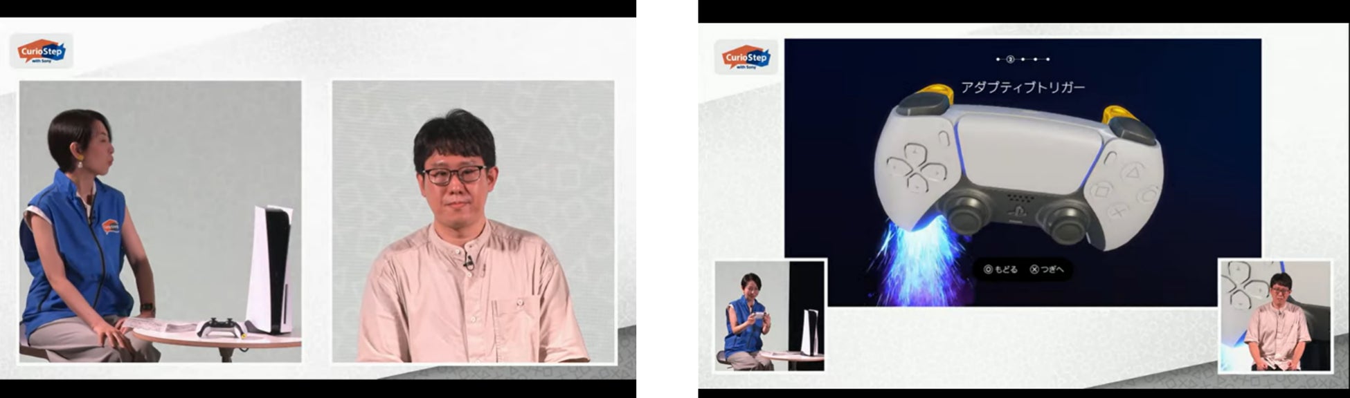 またイベントでは、PS5の特徴についてさらに理解を深めるため、MCがPS5を実際に起動し、PS5本体やコントローラーについても深く知ることができるゲーム「ASTRO's PLAYROOM」に挑戦。土田の解説のもと、手に伝わるリアルな振動や、タッチパッドをなぞった指の動きが線になって画面に反映される機能など、コントローラーの多様な機能を紹介しました。