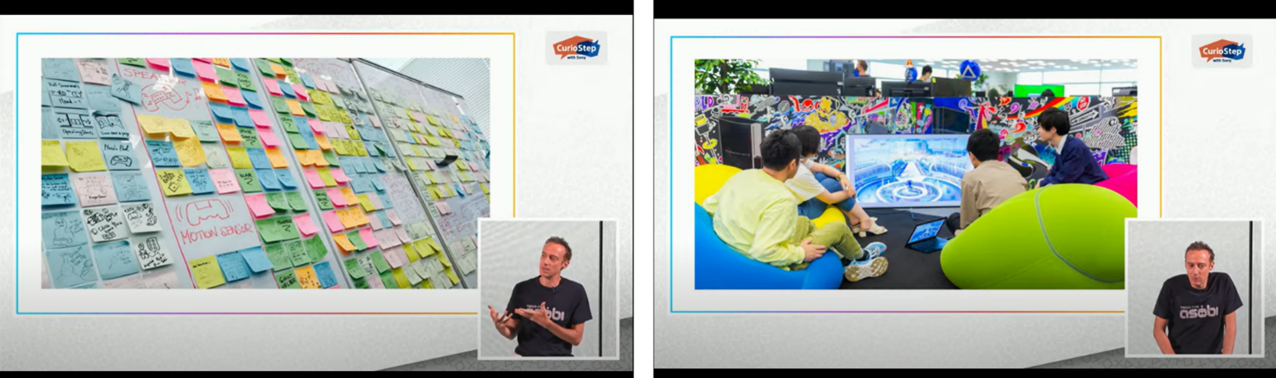 続いて、ゲーム「ASTRO's PLAYROOM」の制作に携わる二コラより、「ASTRO's PLAYROOM」制作時の画像を見ながら、ゲームソフトがどのような過程を経て作られているか解説しました。ホワイトボード一面にたくさんのアイデアを書き出し、チームのメンバーと共有している様子を見せると、視聴者からは「すごい!」「こんなに考えてつくられているんだ!」と感動のコメントも。二コラはゲームソフトの制作について、ゲームで人をワクワクさせるために大切なのは、小さい子どもからご年配の方まで、老若男女が楽しめるものをつくること。また、ゲームクリエイターは、素晴らしい技術を魔法にかえる仕事であると語りました。