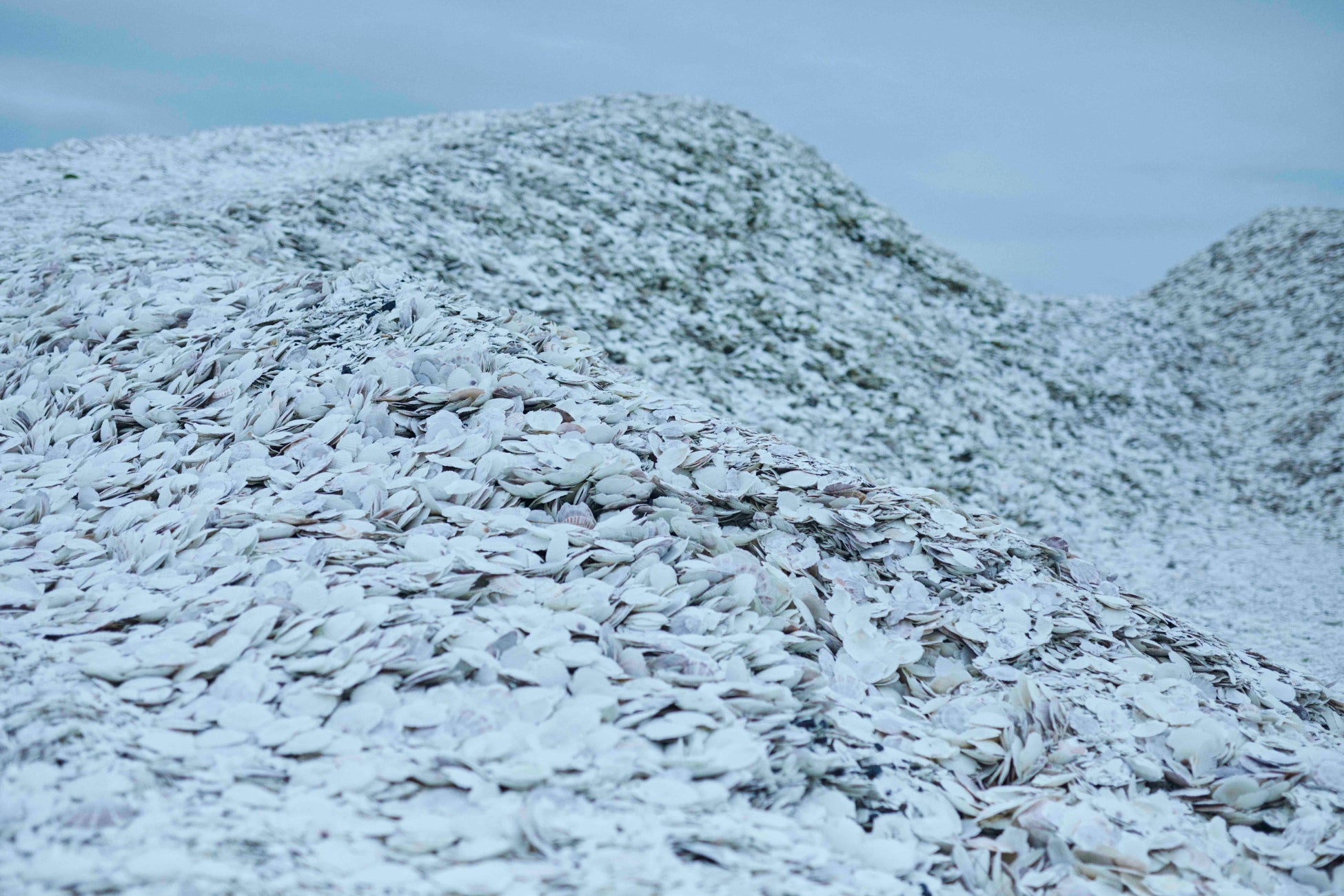 ホタテの水揚げ量日本一を誇る北海道猿払村が位置する宗谷地区では、ホタテを加工する際に水産廃棄物として貝殻が年間約4万トン発生しています。*さらに2021年には、貝殻の再利用を目的とした国外への輸出が途絶えてしまったことを機に、地上保管による環境への影響や堆積場所の確保などが地域における社会問題となっていました。