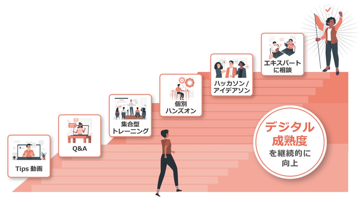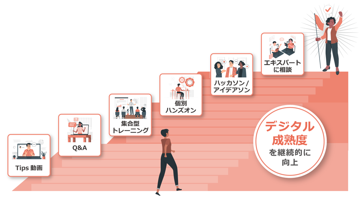 一過性のトレーニングだけでなく、継続的にデジタル成熟度を高めるための学習サービスをさまざまなコンテンツでご提供し、デジタルリテラシーの底上げを実現します。