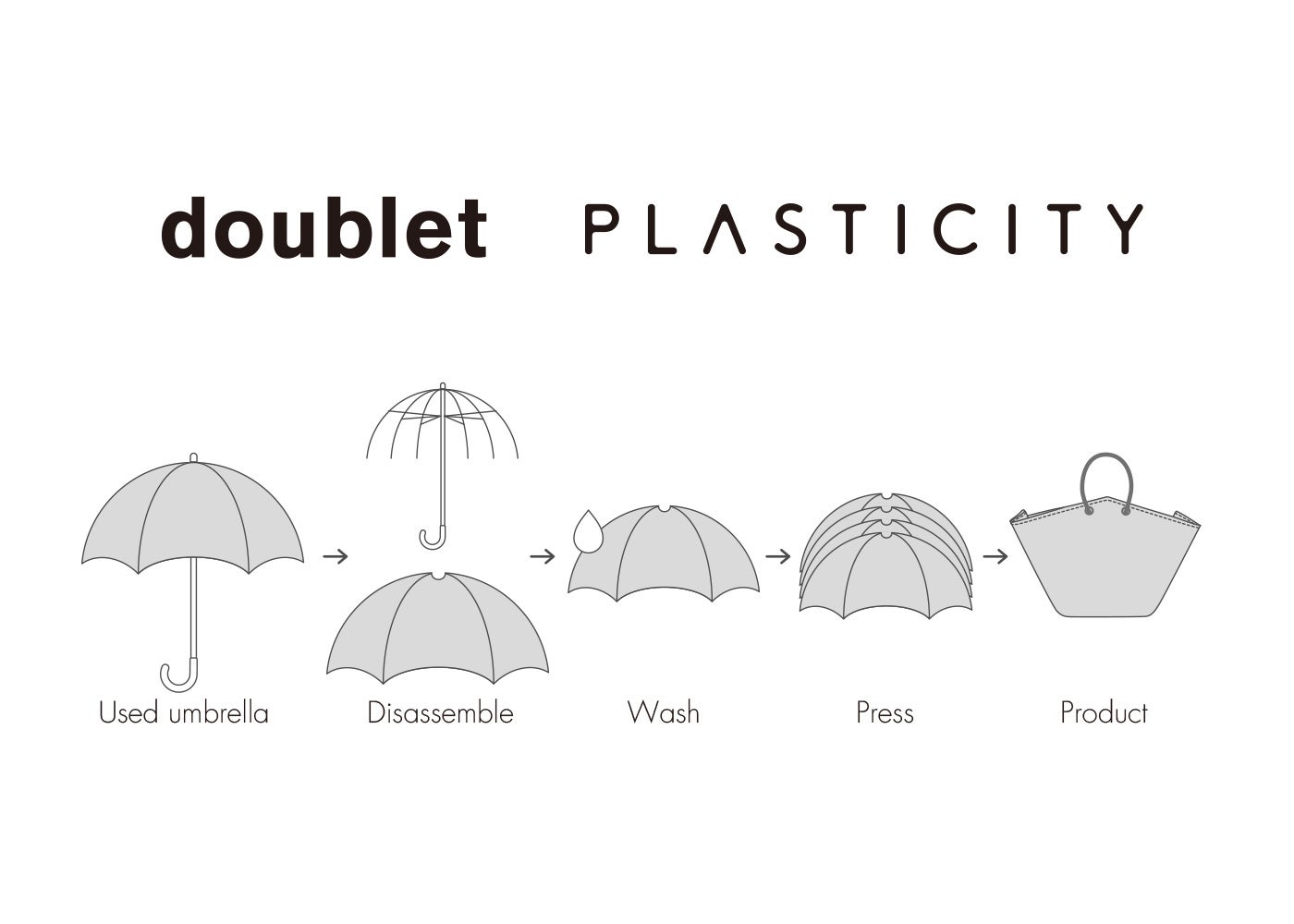 廃ビニール傘の再利用に取り組んでいるアップサイクルブランド PLASTICITY(プラスティシティ)※ は、「違和感のある日常着」 をコンセプトに、遊び心のあるデザインのアイテムを展開するブランド doublet(ダブレット) とのコラボレーションで、傘型のユニークな「UPCYCLE UMBRELLA BAG」を製作しました。本商品は、doublet取り扱い店舗およびPLASTICITYオンラインストアにて販売されます。