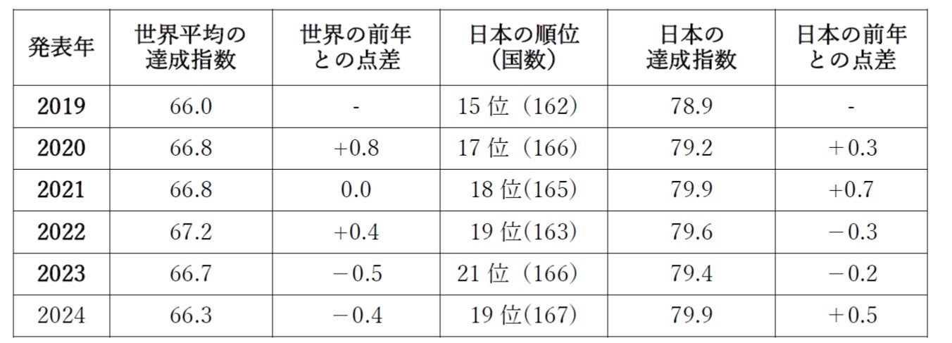 表1:世界と日本のSDGs達成指数の動向