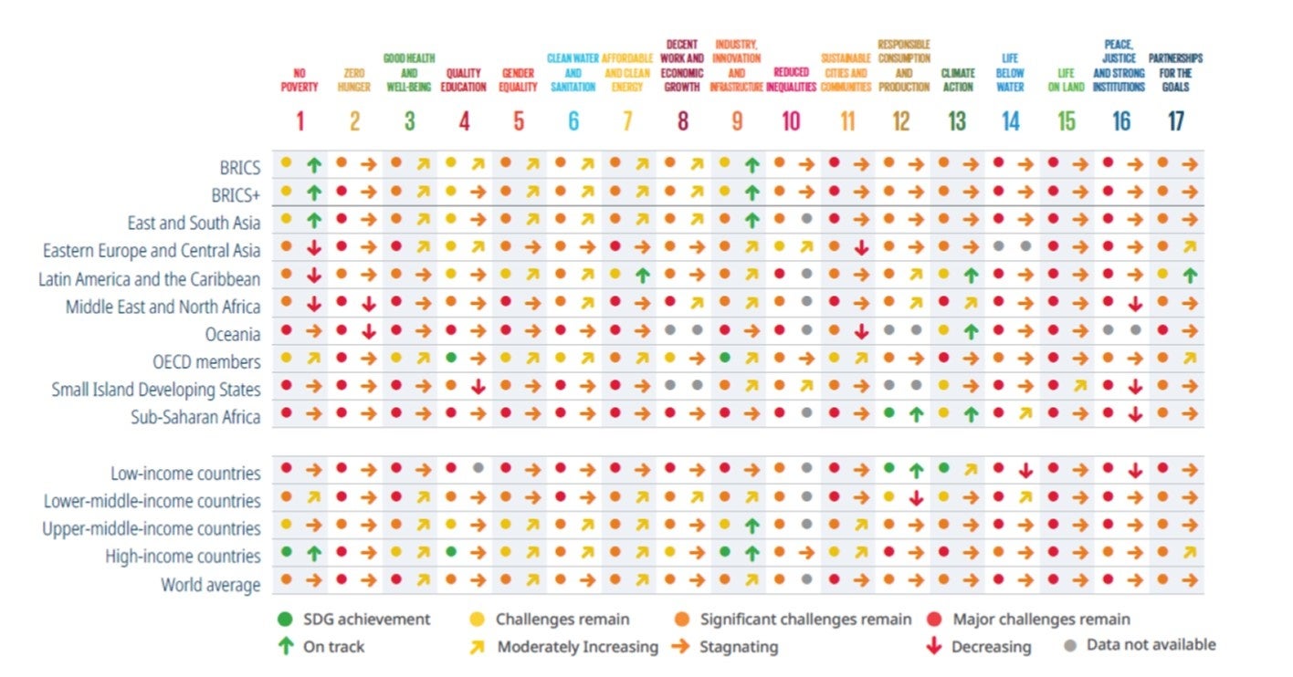 SDGsの達成ペースは国グループによって大きく異なる。北欧諸国は引き続きSDGsをリードしており、BRICS諸国[iii]は大きな進歩を遂げている一方で、貧困国や脆弱国は大きく遅れをとっている。
