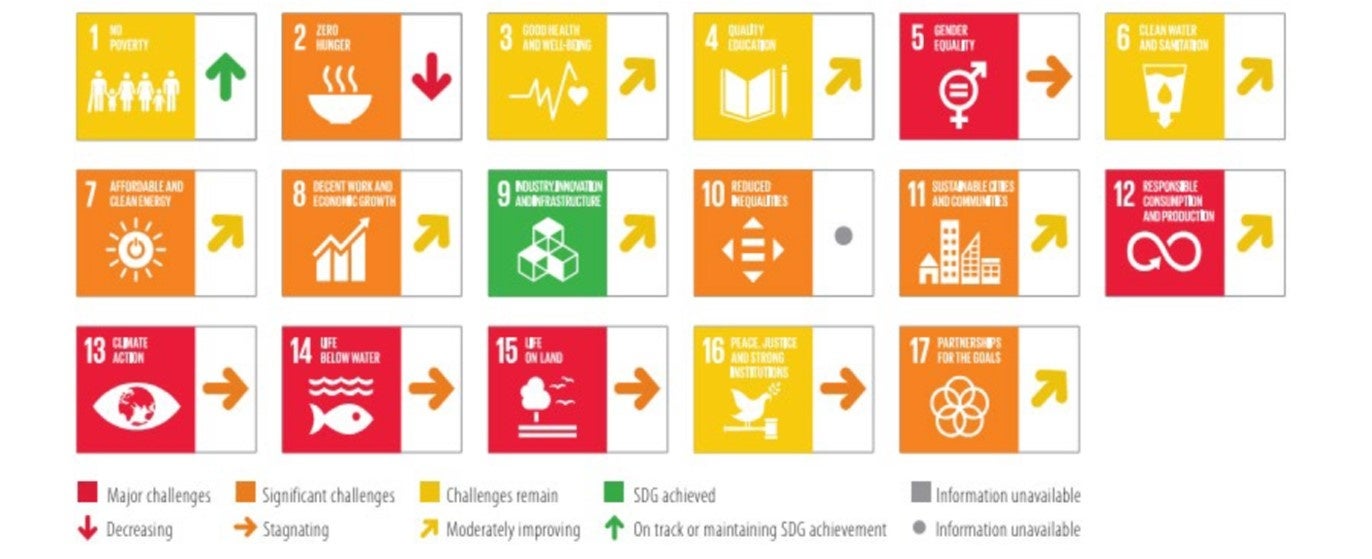 (SDGs achievement=SDGs達成、Challenges remain=課題が残る、Significant challenges remain=顕著な課題が残る、Major Challenges remain=深刻な課題が残る、On track=目標達成見込み、Moderately Increasing=緩やかに改善、Stagnating=停滞、Decreasing=後退)