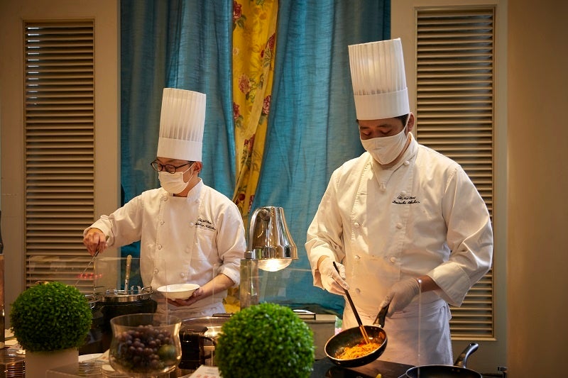 甘いスイーツもいいけれど、フードメニューもやっぱり外せません。魚介の風味が口の中に広がる「シーフードラグーパスタ」 や、辛さが苦手な方でも安心の「特製キーマカレー」 は、ライブ感溢れるシェフのクッキングサービスで提供いたします。他にも、一口サイズの2種類のサンドウィッチ や、自家製生地のピッツァ などホテルニューオータニ博多自慢のメニューをご用意いたします。